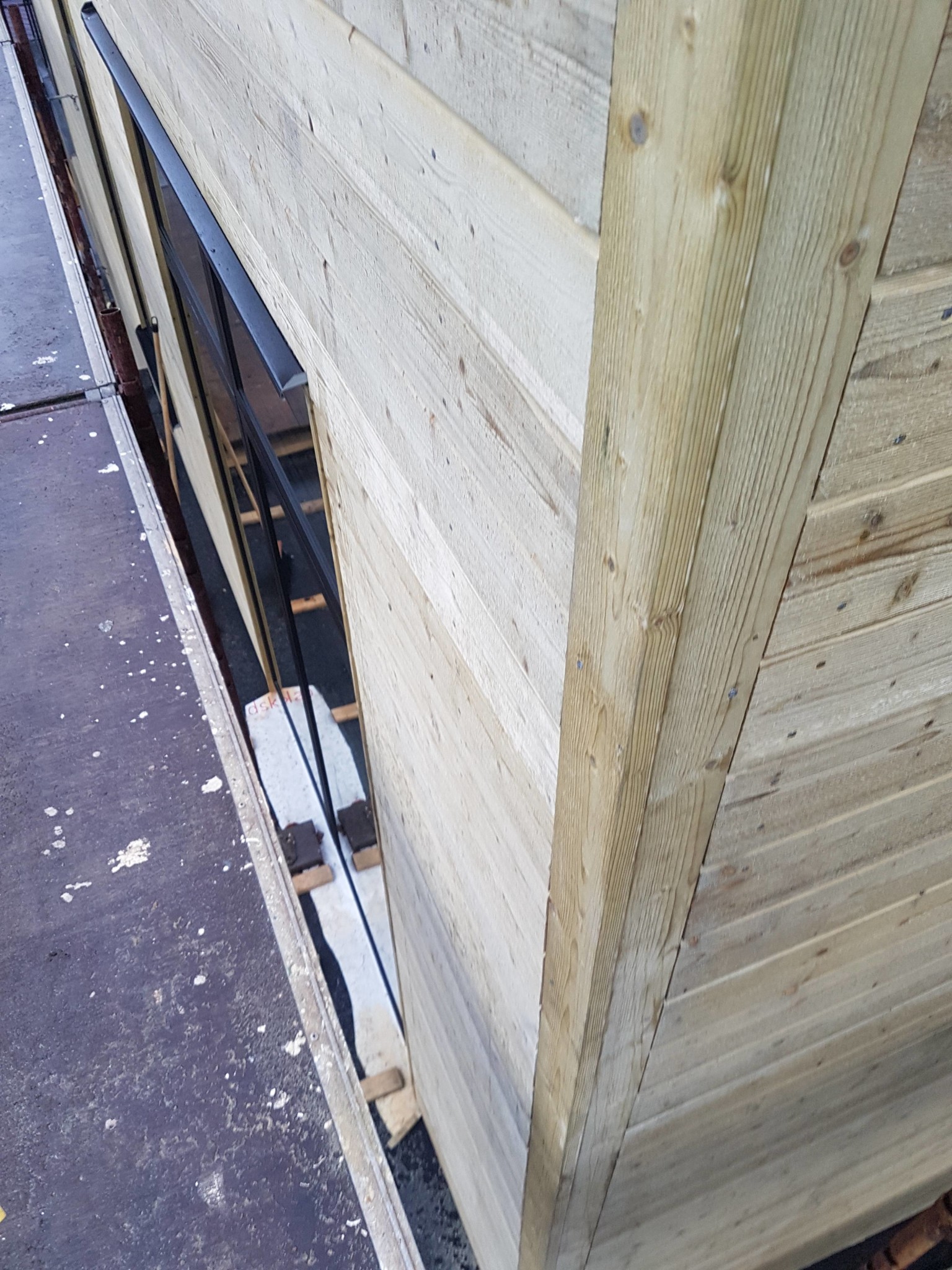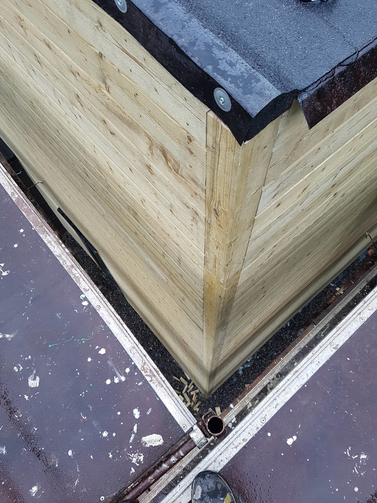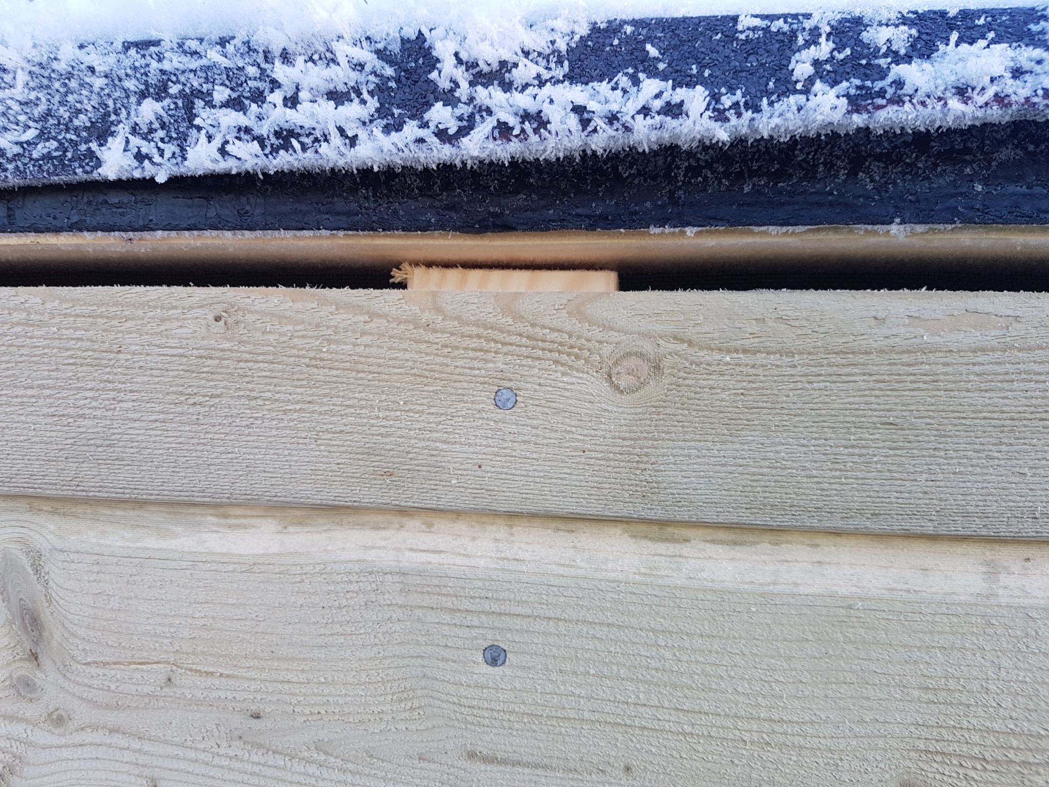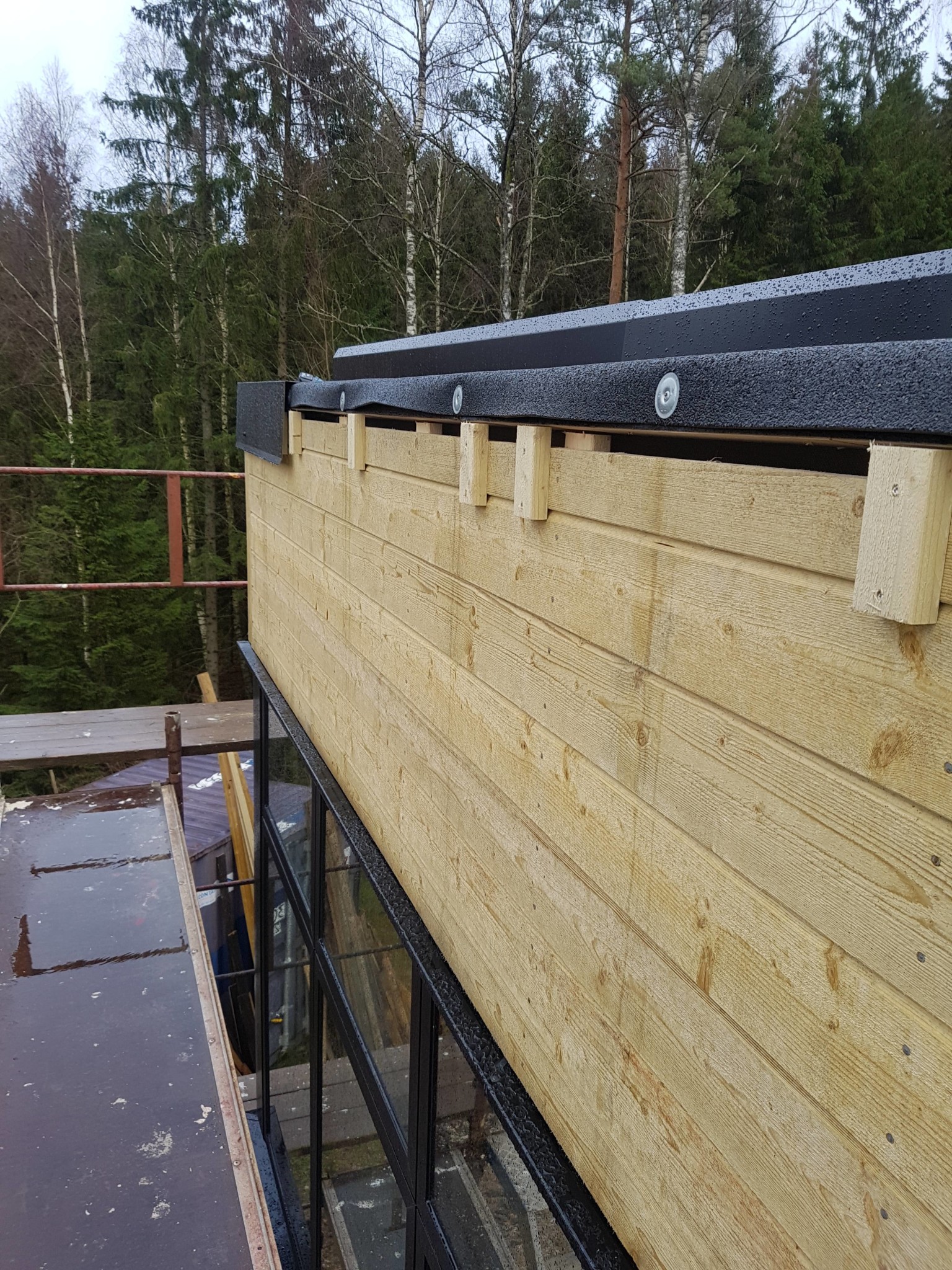 Plåtslagaren bockade plåten och fixade hörnen, så jag kunde montera allt själv. Skruvade dit lite klossar som distanser så att luftningen av tak och väggar blir intakt. Gör också att plåten blir jämn och fin trots att takpappen är lite bubblig.