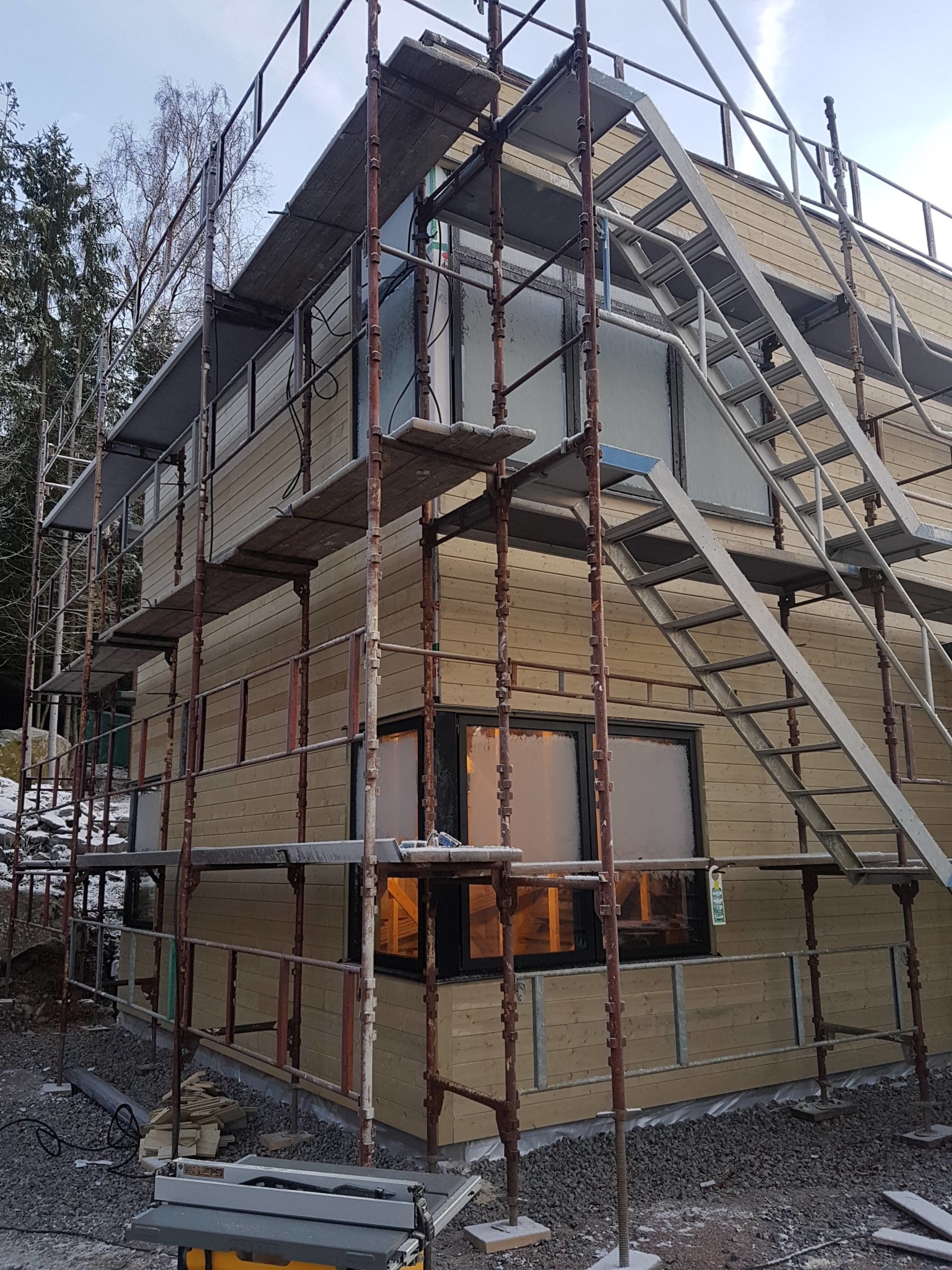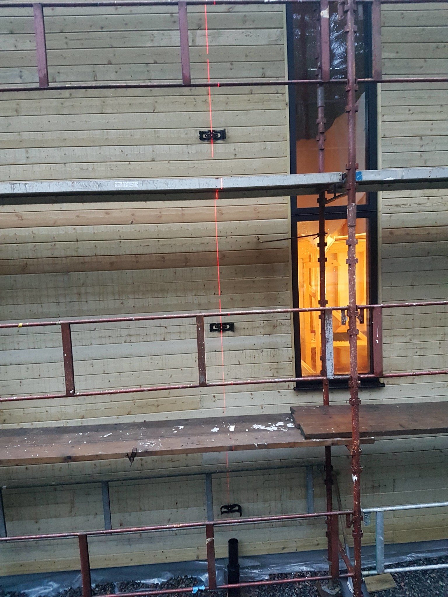 Måste säga att en korslaser är väldigt användbar, borde köpt en mycket tidigare. Den vi köpte (Bosch GCL 2-50) visade sig vara väldigt hållbar också.... När vi avslutade panelen så föll den ner från översta ställningsvåningen. Magneter fäster visst inte så bra på isiga ställningar