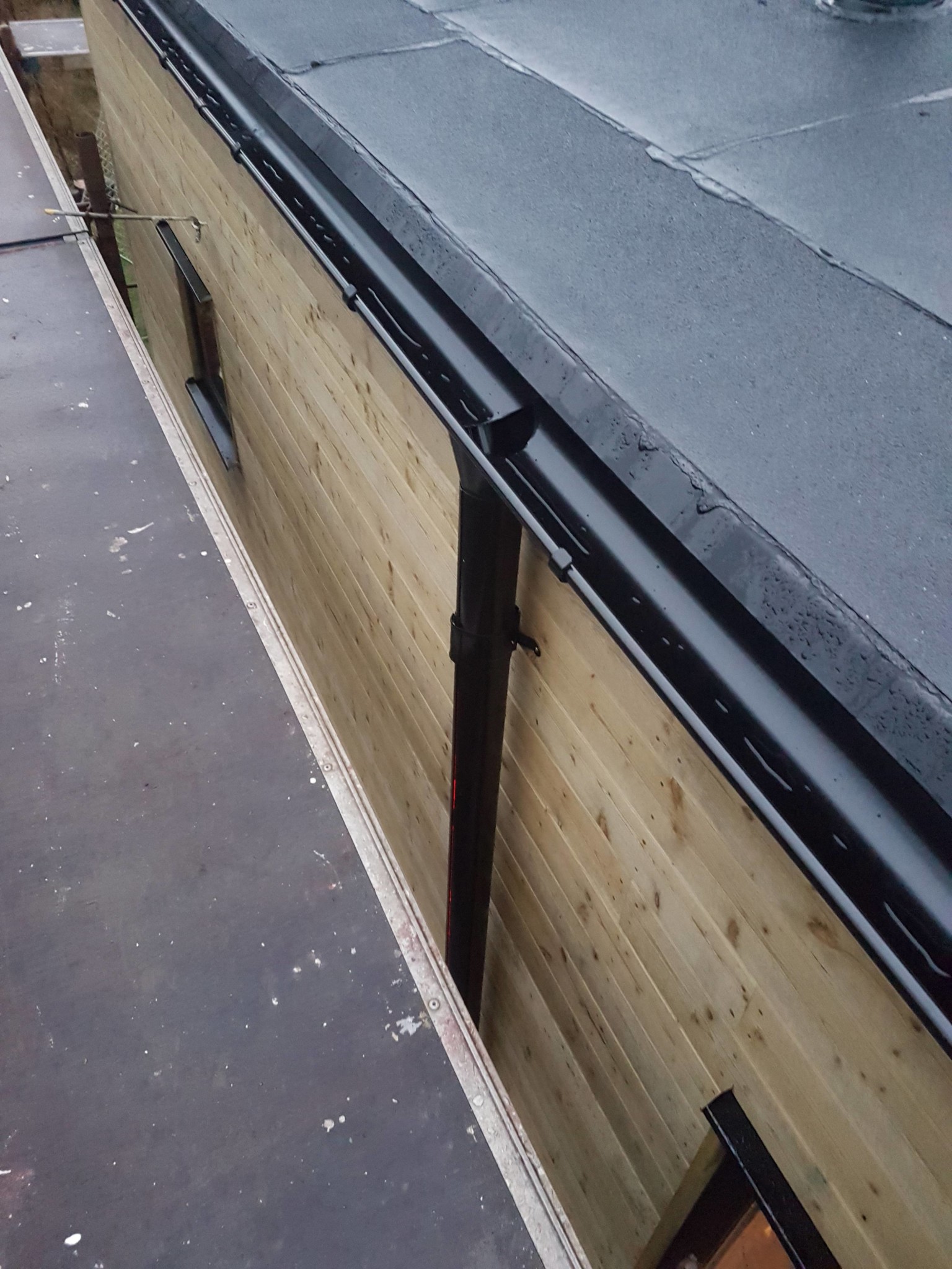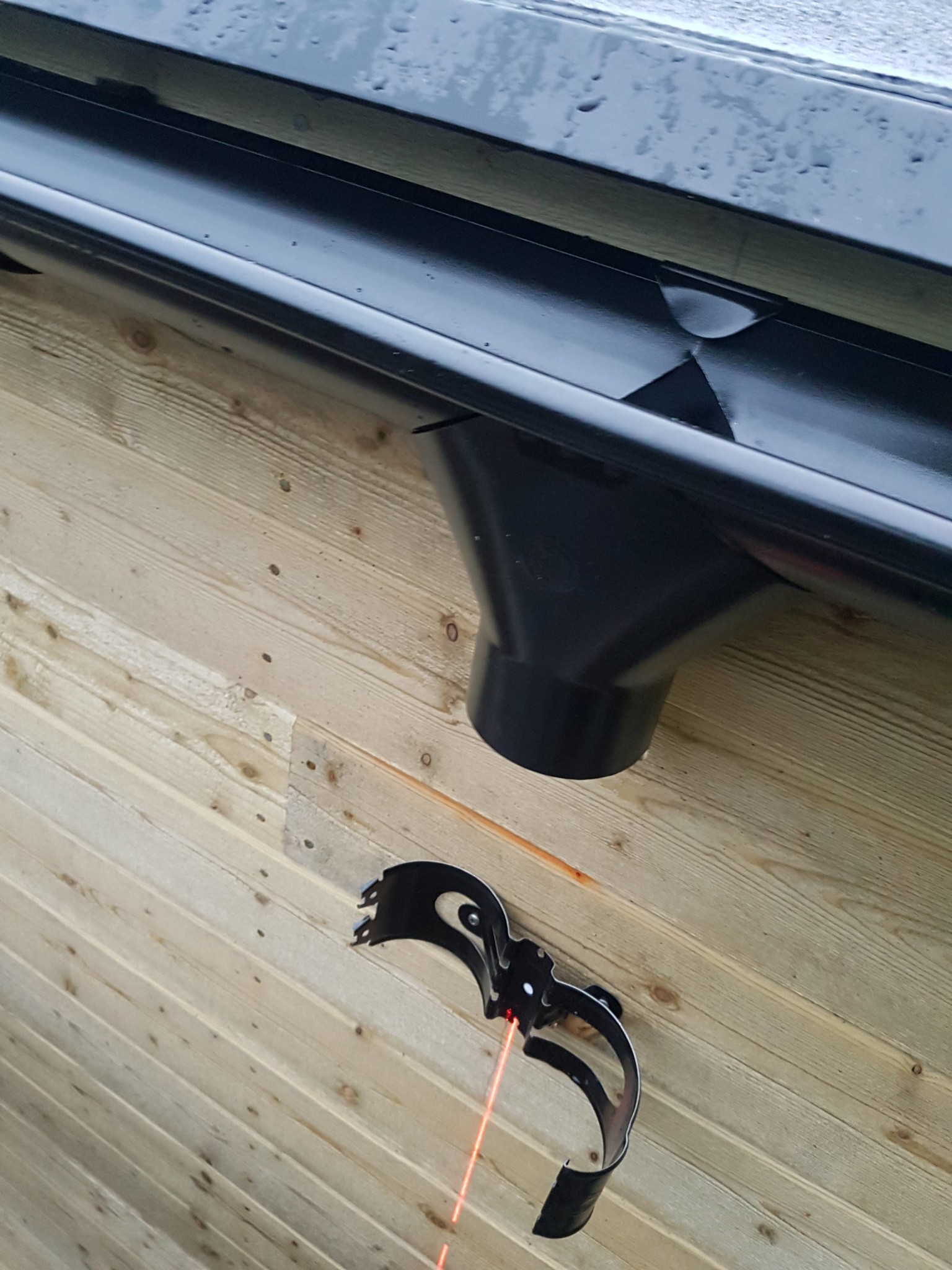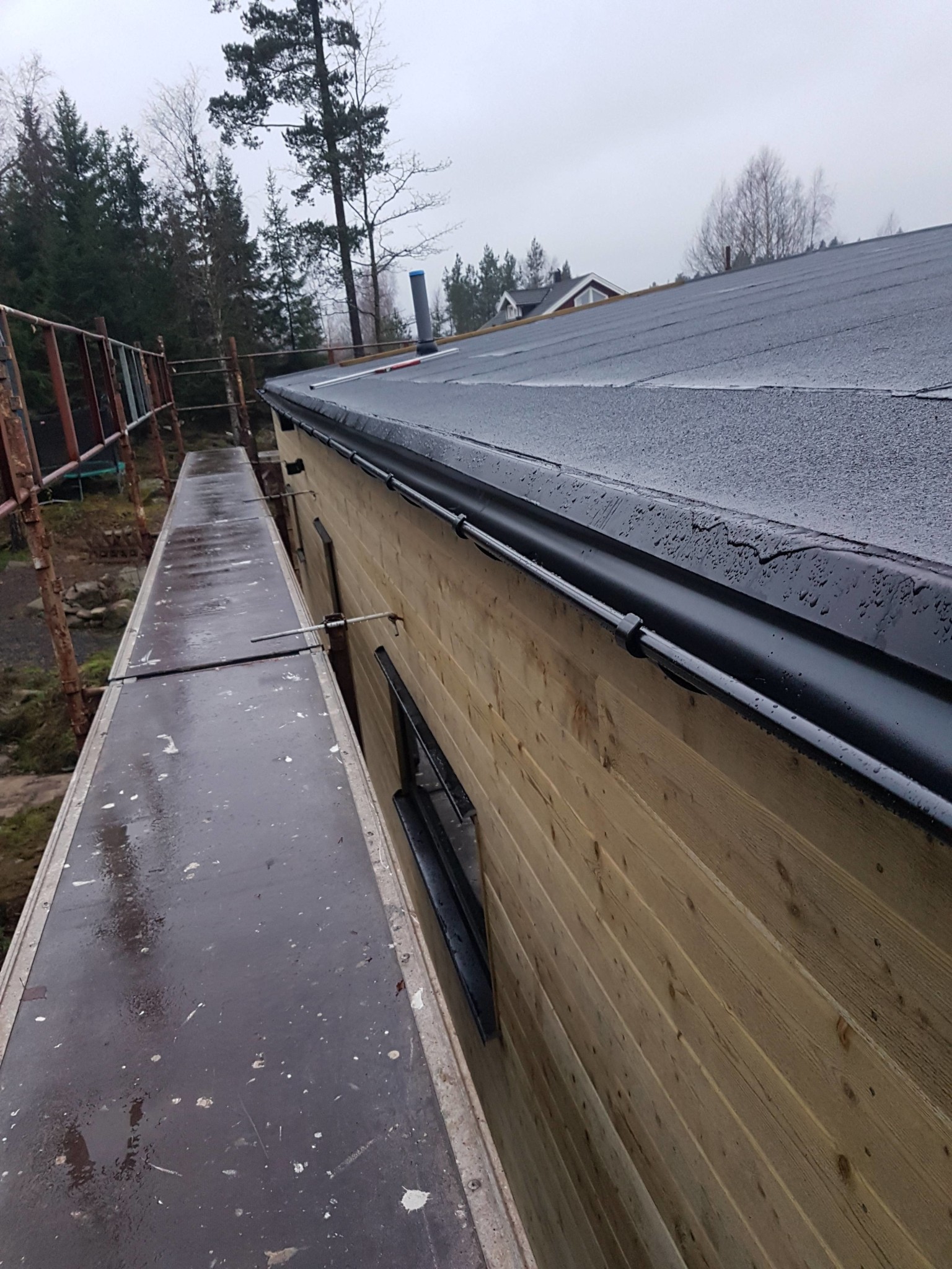Rännor från Lindab monterade. Eftersom vi har hörnfönster kan vi inte ha stuprör vid ena knuten. Så därför hamnar det ungefär på mitten.