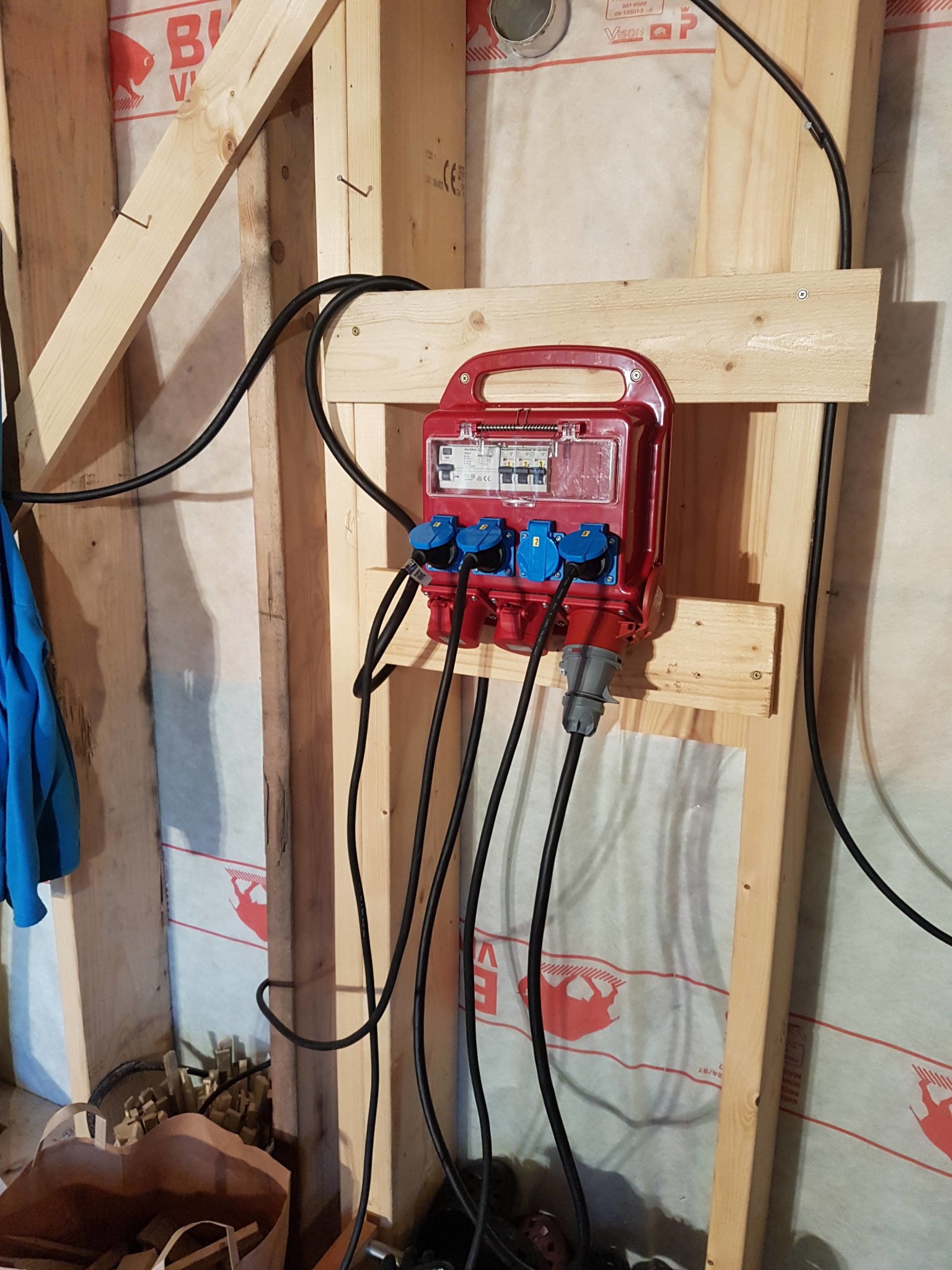 De senaste dagarna har jag mixtrat en del för att få igång alla byggfläktar vilket visade sig vara svårt. Har tre fläktar på 2 kW styck. Eftersom de drar så pass mycket fungerar det inte att koppla in mer än en på varje 10A säkring. Och det är krångligt att hitta lämpliga uttag som ligger på olika säkringar. Tillslut köpte vi en byggcentral istället och drog upp en trefaskabel genom de rör vi la ner i plattan. Så nu kör vi alla fläktarna, en på varje fas.
