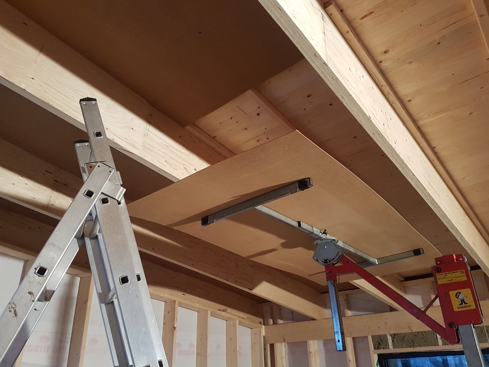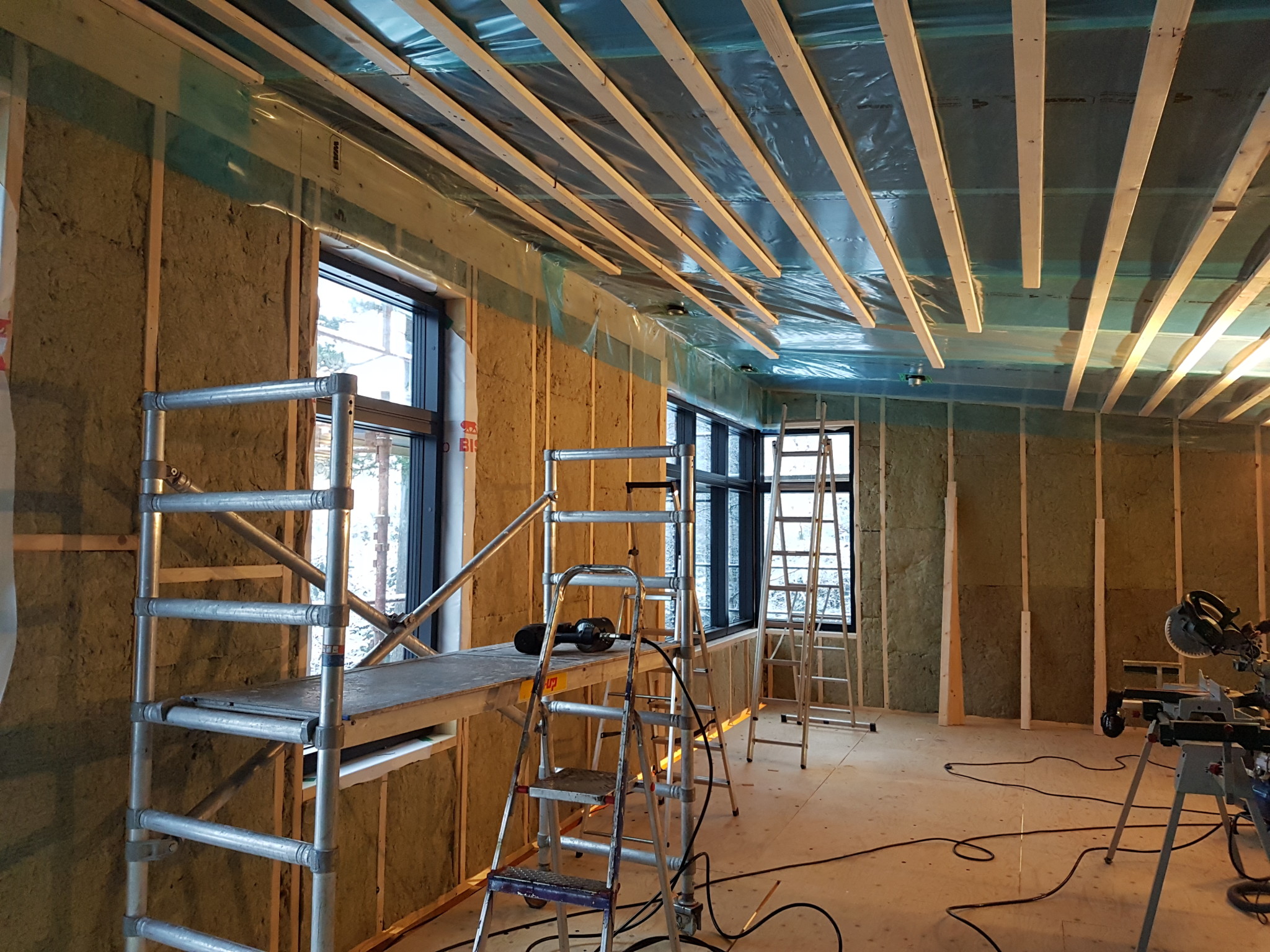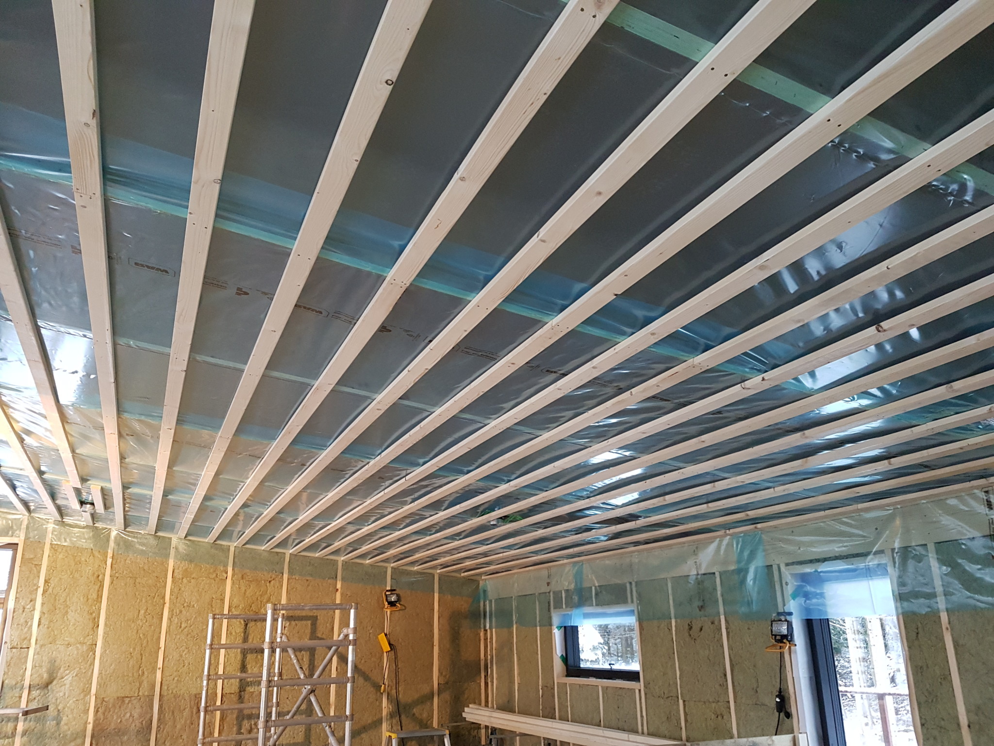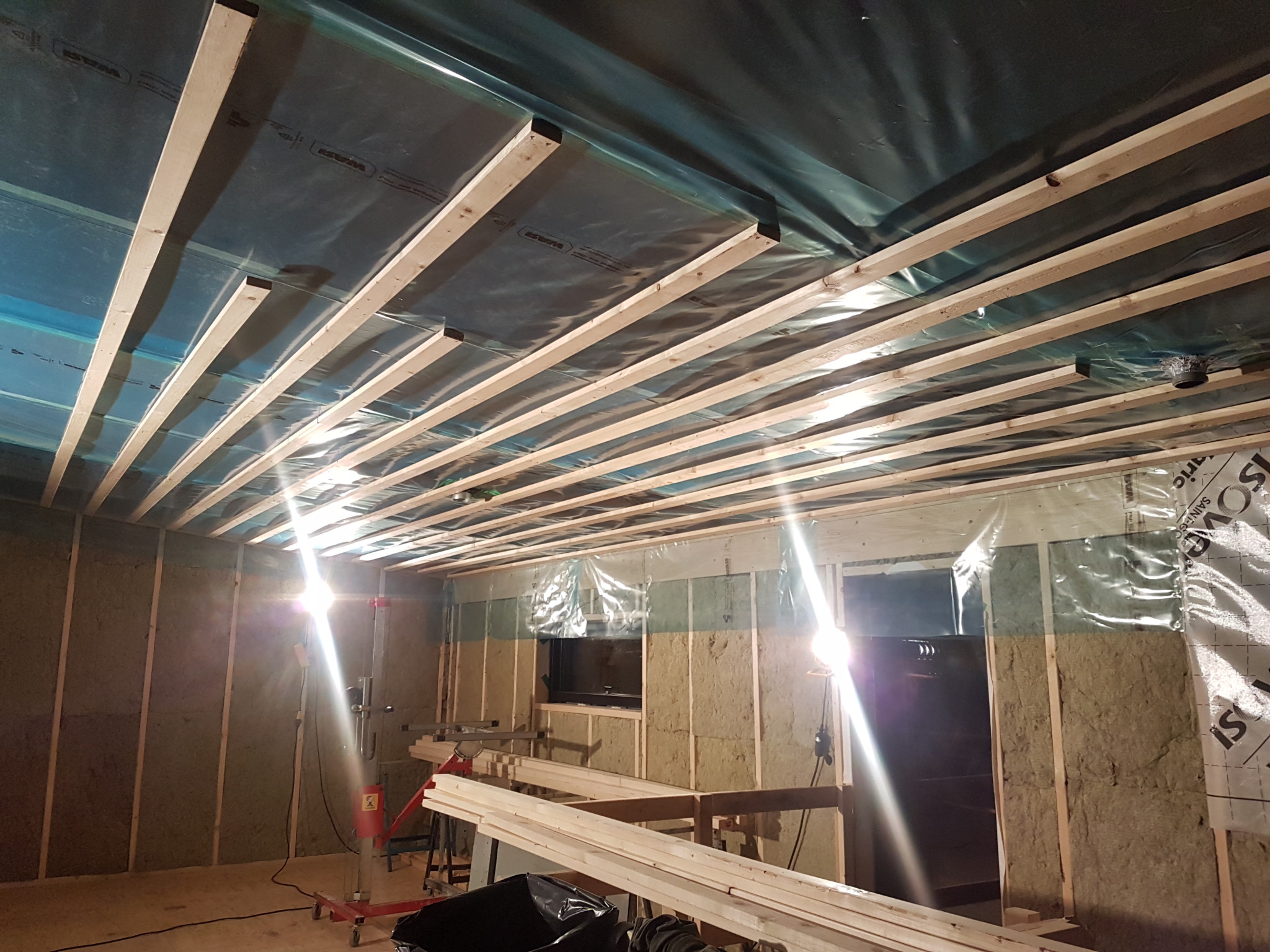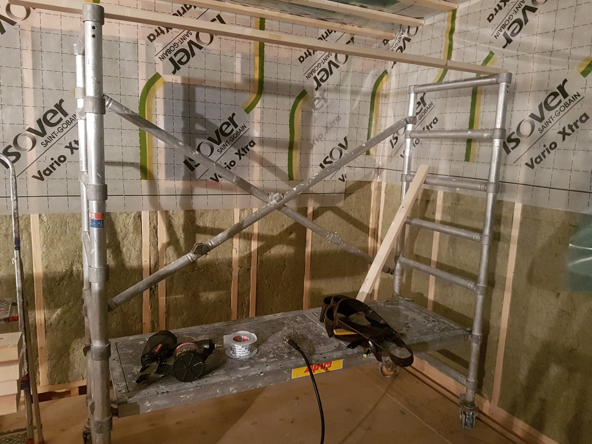 All gles spikad. Imorgon kommer en firma som sprutar lösull i taket. Efter att ha jobbat en del i taket ock tröttnat på stegar så köpte jag en begagnad rullställning. Går så mycket enklare med den