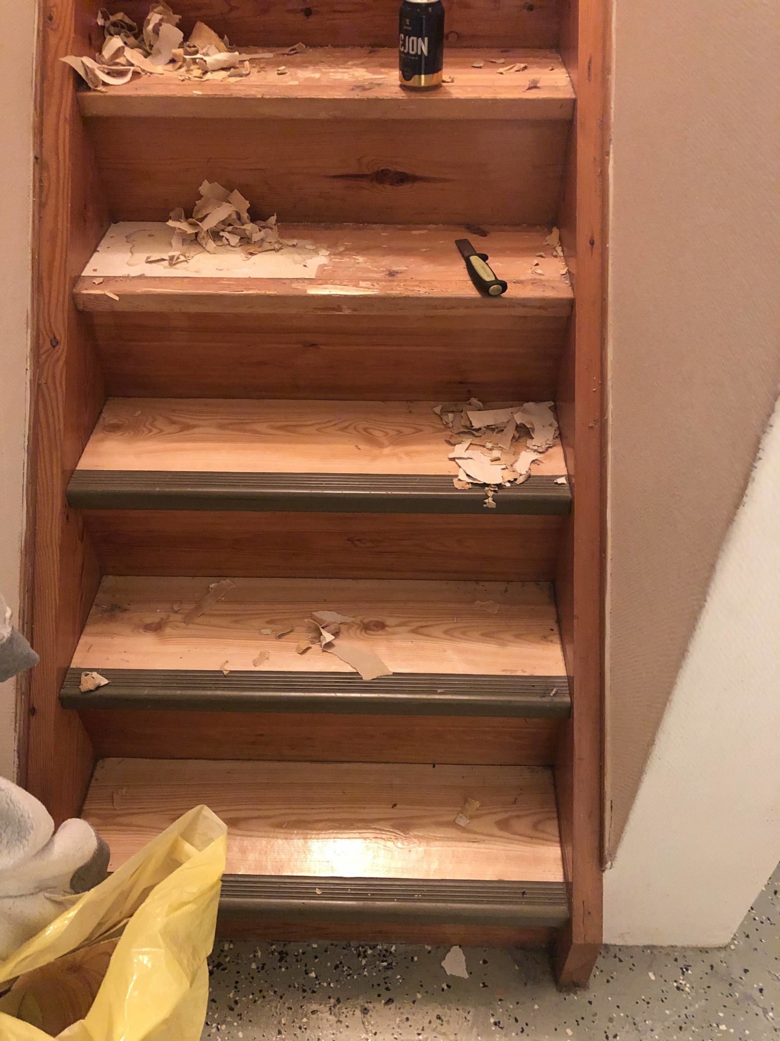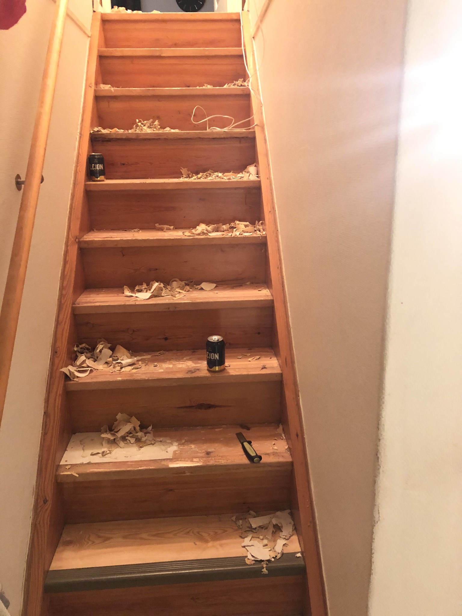 Jag och kompisen ska börja gräva för dräneringen och lyfta ner L-stöd i garagenedfarten, svärfar ska göra lite av allt och sambons bror ska slipa trappan samt behandla den med någon speciell lack. Började riva bort den äckliga mattan som låg på varje steg för att underlätta hans arbete. Återkommer under helgen för mer bilder och uppdateringar
