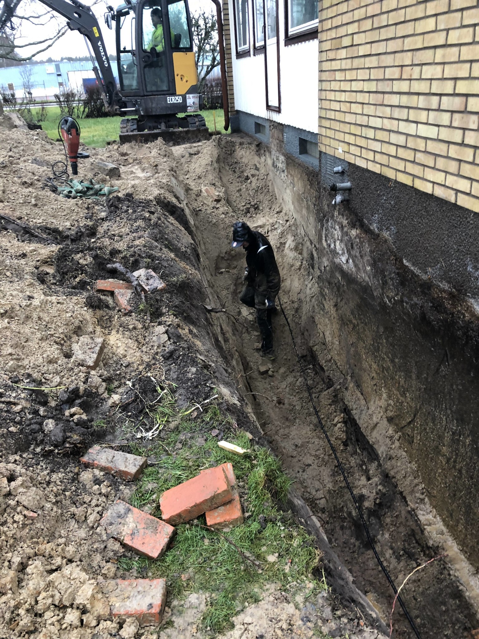 Idag grävde vi upp två sidor av huset, det var inte lätt i regn och blåst. Då det mesta runt huset är sand så ville det rasa oavsett hur mycket vi grävde, får se hur mycket det blir att gräva när man ska ner och slipa väggarna. Någon som har några bra knep eller tips för att undvika ras?