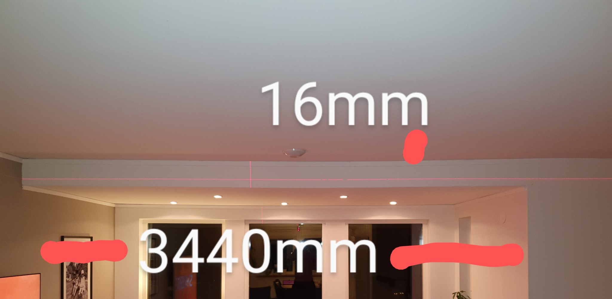 Mitt problem är den limträbalk (240x95) som hänger ner ca. 6-7mm. Den stöttas som ni ser av två pelare 90x70 varpå de har två 145x45 på utsidan. Motsatt sida yttervägg har limträbalken mindre upplag än halva 90x70 pelaren. Även invändigt syns en nedböjning på upp till 16mm.