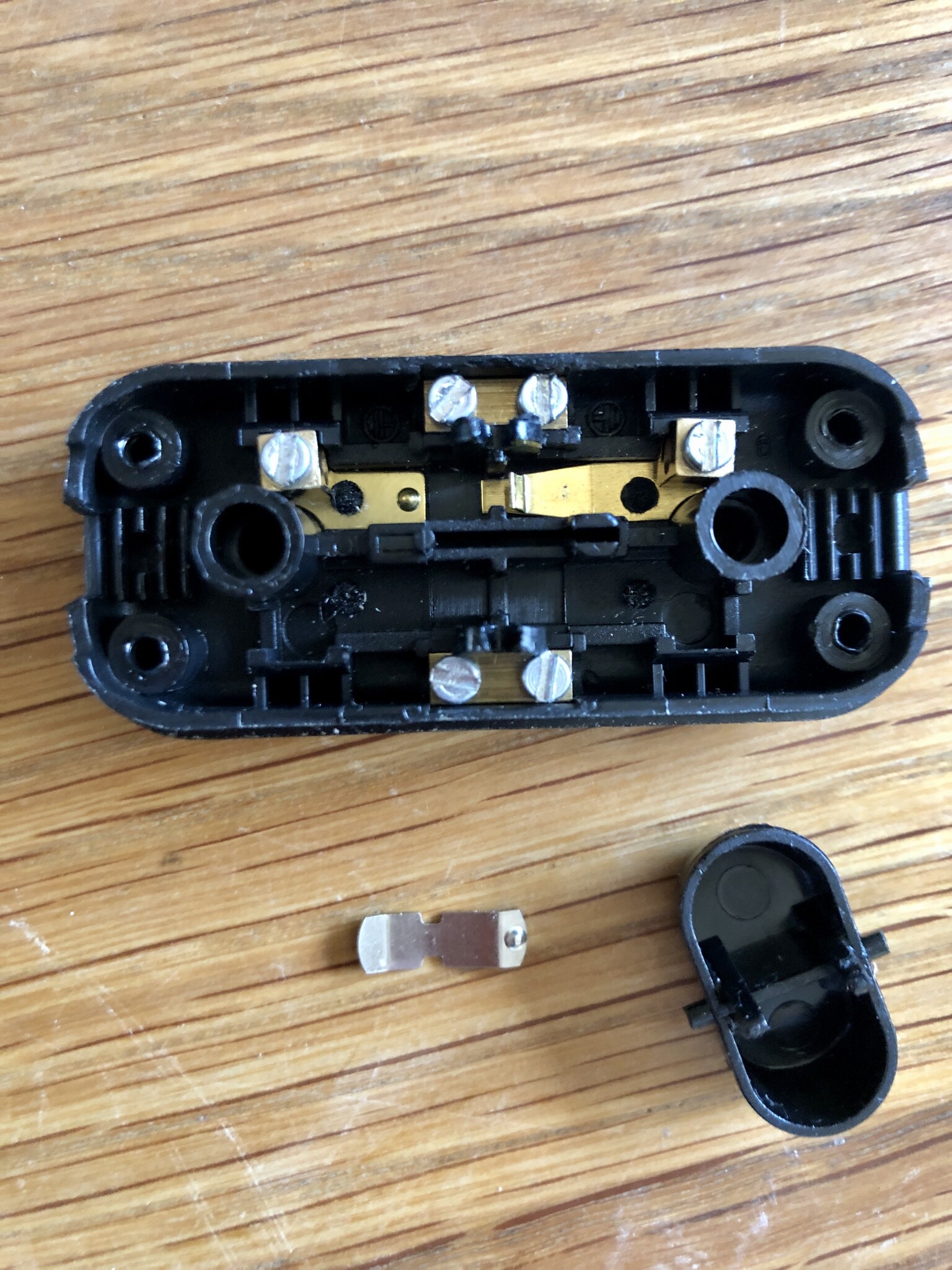 Jag har föresatt mig att montera en Gelia strömbrytare på en sladd och det gick ju jättebra tills jag skulle sätta ihop den och det inte gick att "klicka" strömbrytarvippan fram och tillbaka. Efter mycket letande fann jag en liten plåtbricka som ramlat ur strömbrytaren, men hur ska den sitta???? Det är den där lilla plutten som ligger i nederkant på bilden.