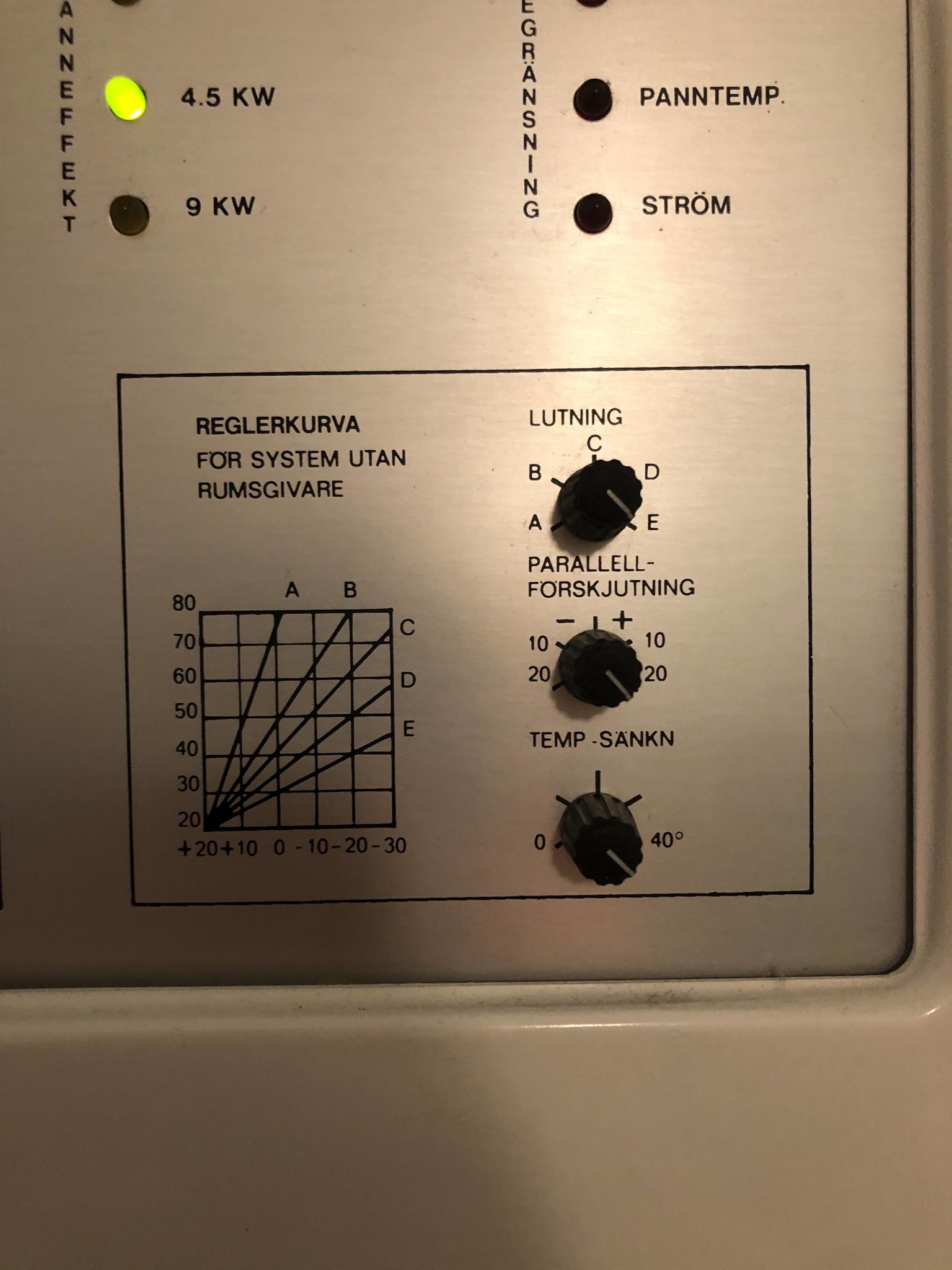 Om jag vill behålla en temp på övervåningen på 19-20grader, hur ska jag ställa reglagen på en sån här panna. reglaget jag har i trappen står på 19grader, dock är alla lampor på elpannan släckta.