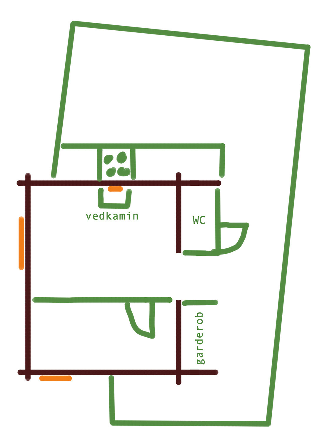 Brunt streck är härbret som det ser ut idag, i originalskick utan några ingrepp. Dörröppningen till höger i bild är alltså original med tillhörande gåtar etc. De orangea strecken är skissade håltagningar för en dörr (till vänster) och totalt tre små fönster in till sovrummen på nedre och övre plan. Dörren står i nuvarande skiss ca 75cm från knuten, fönstren är närmre, men allt detta kan ju enkelt flyttas på utan större effekt på planlösning.