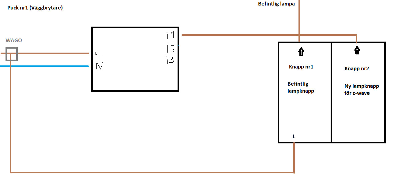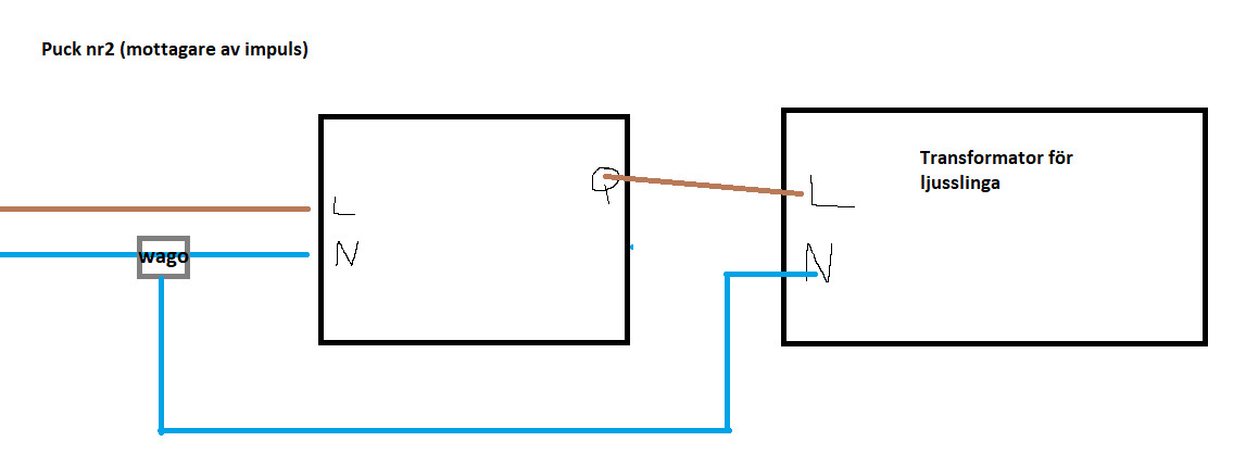 1# N och L ska kopplas in direkt i "pucken" via wago splitters för att strömsätta pucken.