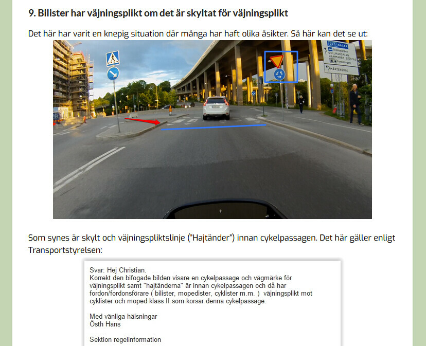 "Jag tog för givet att hennes väjningspliktsskylt och hajtänderna är tillräckligt för att hon ska ha hundraprocentig väjningsplikt mot mig som cyklist, och det verkar även transportstyrelsen ha tyckt för några år sedan, men sen kom en tingsrättsdom där dom dömde till bilförarens fördel pga. att korsningen saknar "här cyklar man" skylt."