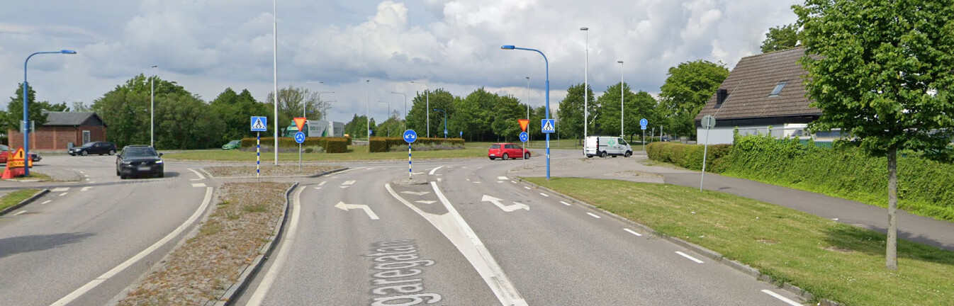Den övre infarten är endast markerad mot själva cirkulationsplatsen, inte mot cykelpassagen.