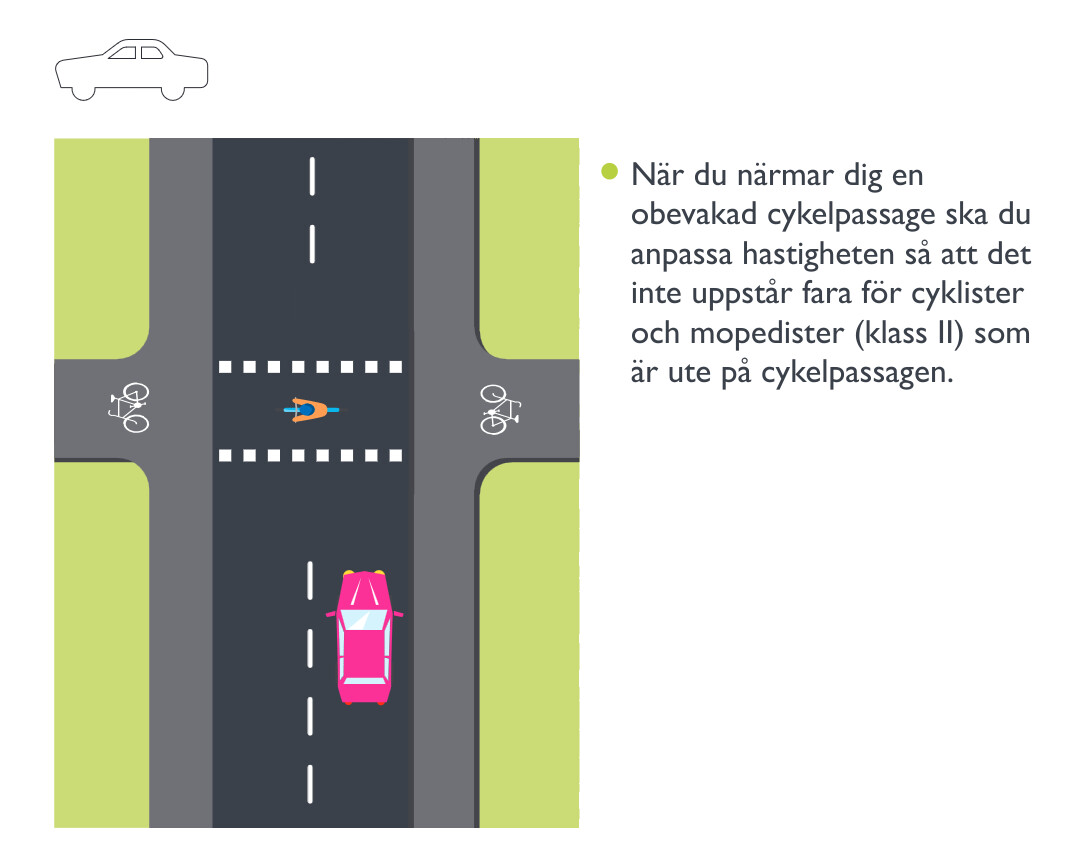 Även om du som cyklist har företräde är det viktigt att ta hänsyn till fordon som närmar sig cykelöverfarten.