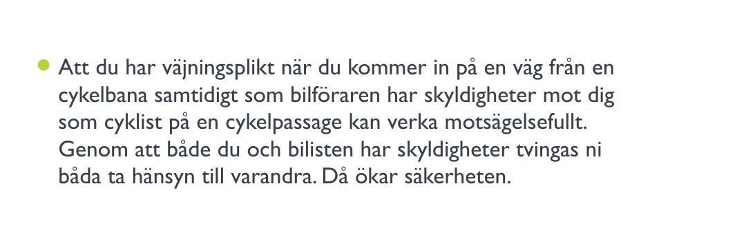Ovanstående innebär inte per automatik att bilisten har rätt att köra på cyklisten om den är ute på cykelpassagen, även om cyklisten har väjningsplikt.