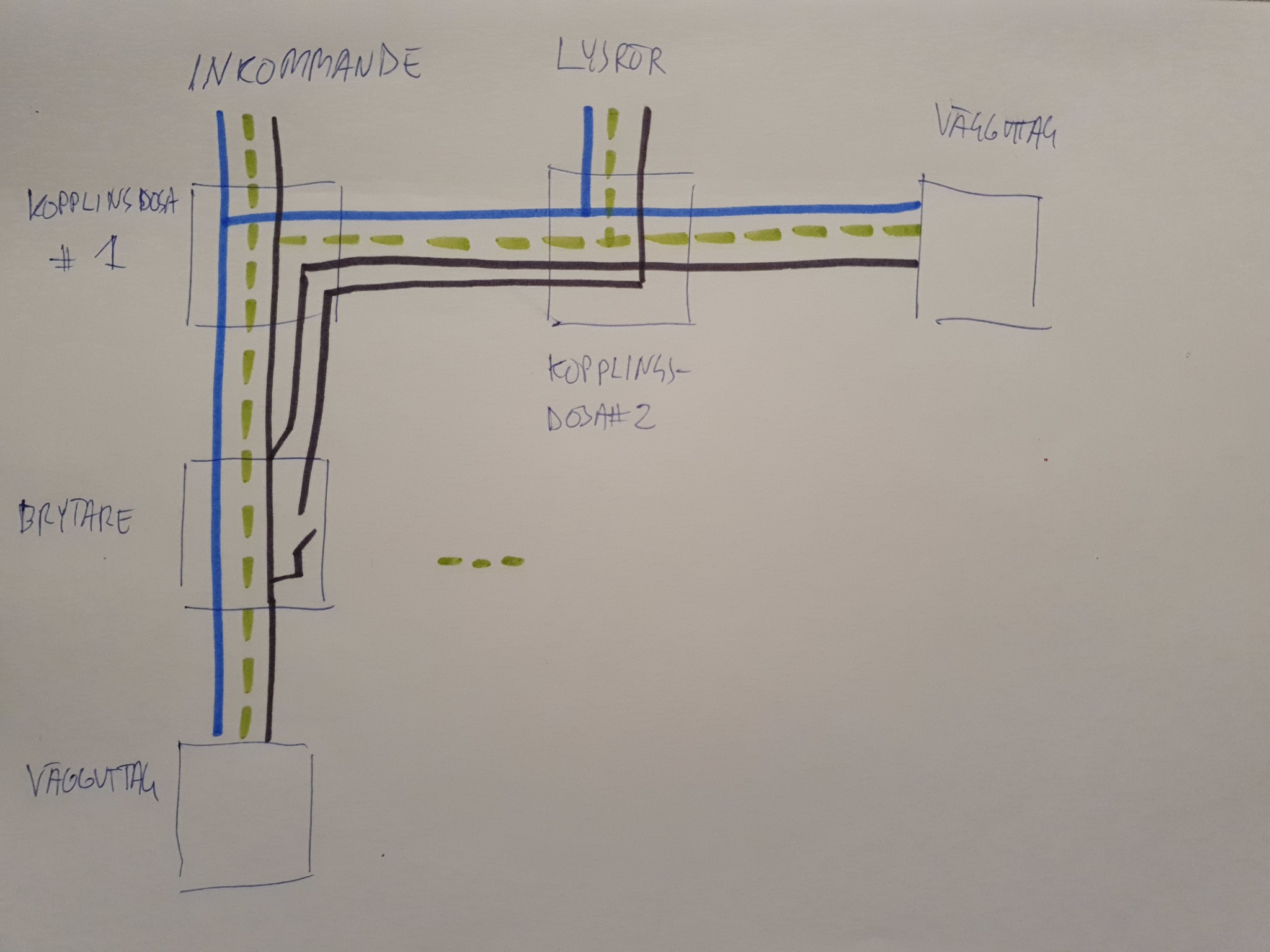 Nej, men allvarligt så kan jag inte se något fel utifrån den skissen. Ta lite bilder på hur det ser ut i dosorna och armaturen.