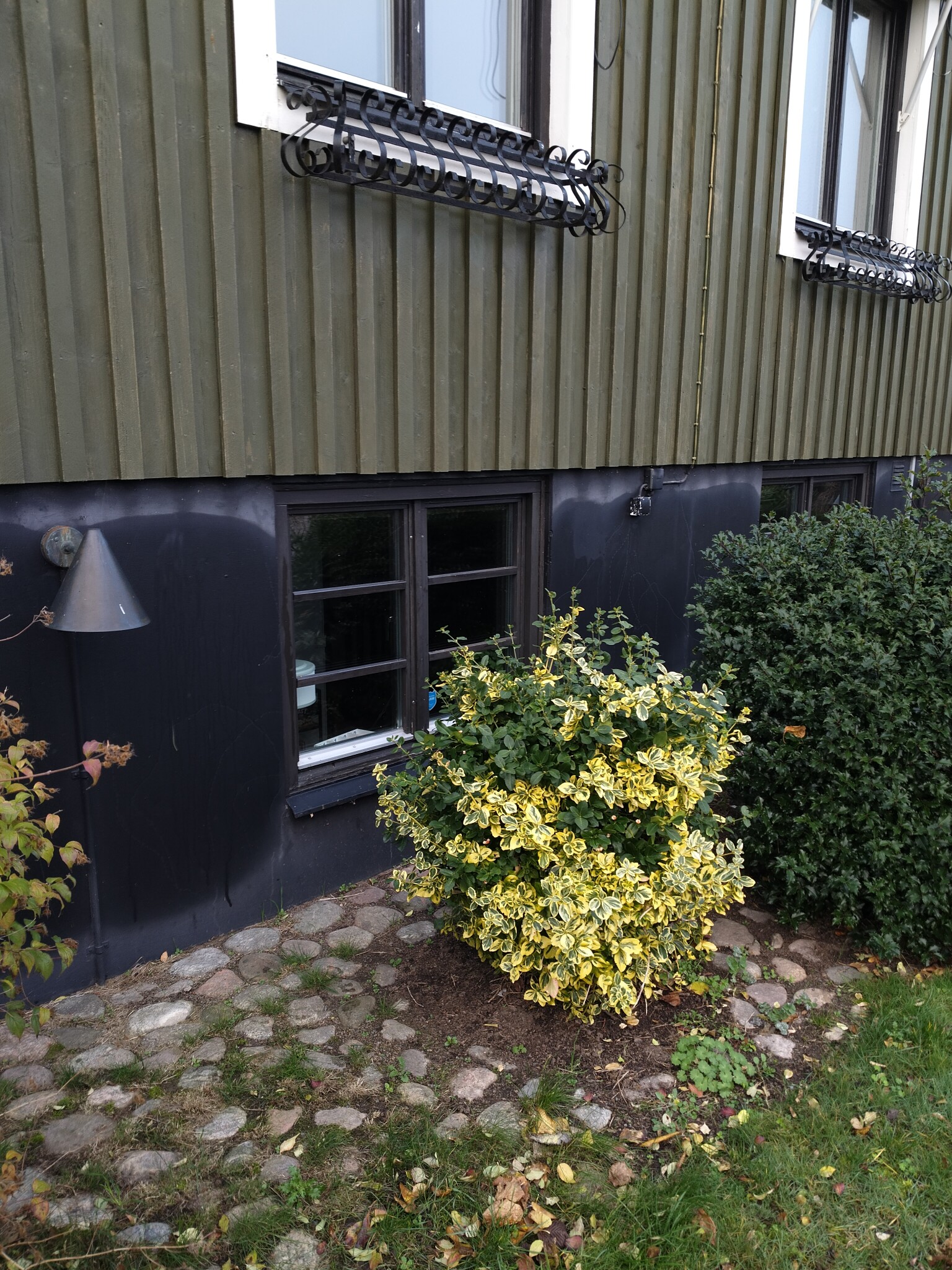 Kondensen bildas mot kalla ytor. Här ser man att det är en (oundviklig) "köldbrygga" vid syllen som leder ut värme till putsen som därför är tillräckligt varm för att fukten i luften inte ska kondensera mot den. Likaså nu på hösten är marken uppvärmd och ger värme till putsen nertill. Suterängväggarna verkar hyfsat välisolerade eftersom det bildas kondens där.
