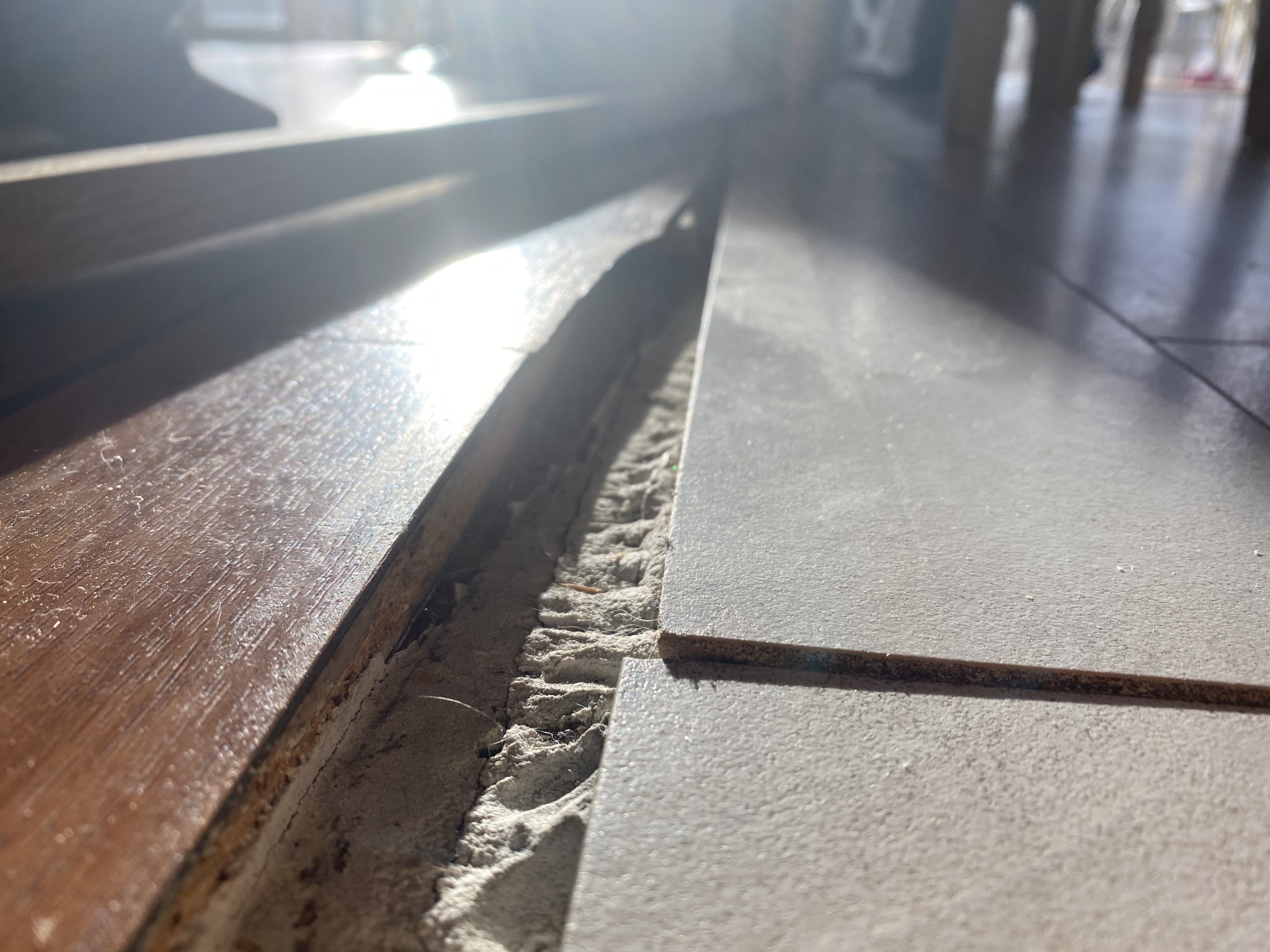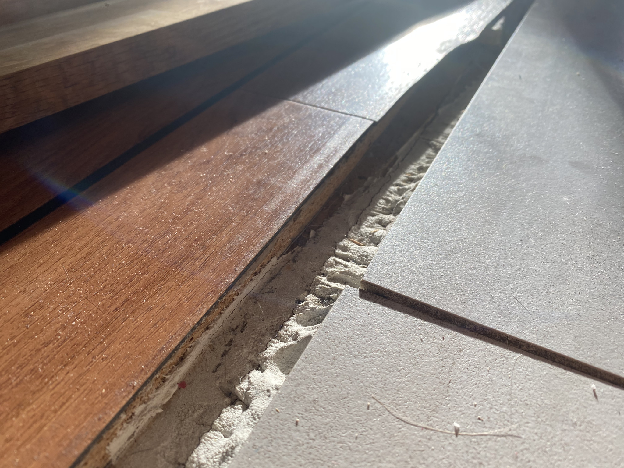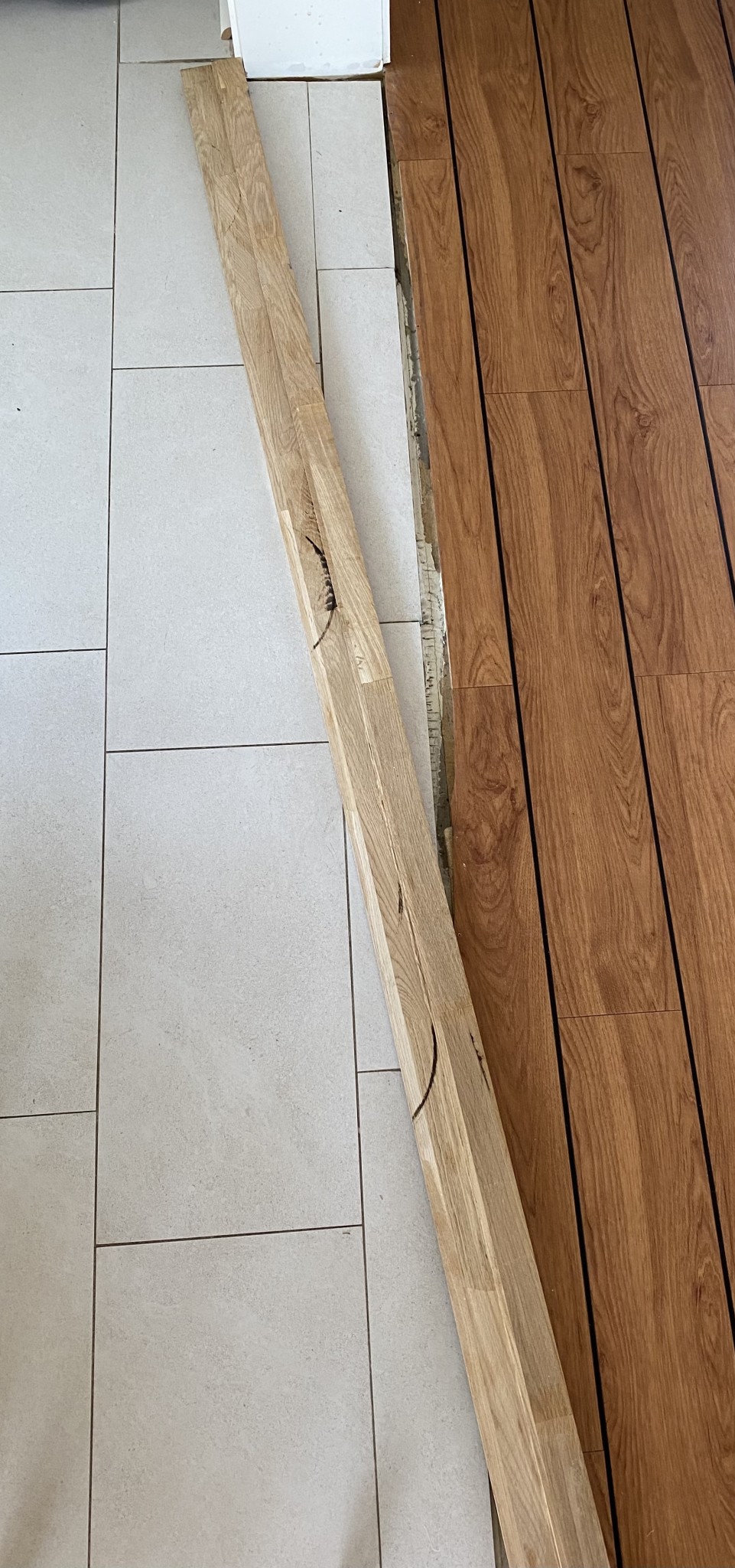 Jag tänkte glatt att det kan inte vara så svårt att snida till nåt eget och med liten bit bänkskiva som blivit över skred jag till verket med att tillverka en tröskel i två olika nivåer. Tyvärr är nivåskillnaden inte jämn utan varierar upp till 7mm på olika ställen (ingen jämnt fallande nivåskillnad), och jag orkar faktiskt inte hålla på att nivåanpassa längre! Kan jag kompensera för nivåskillnaden på något sätt och fortfarande få det snyggt? Exempelvis gjuta upp till samma nivå som andra golvet eller lägga nån typ av mjukfog för att nå upp i nivå? Har någon bra tips?