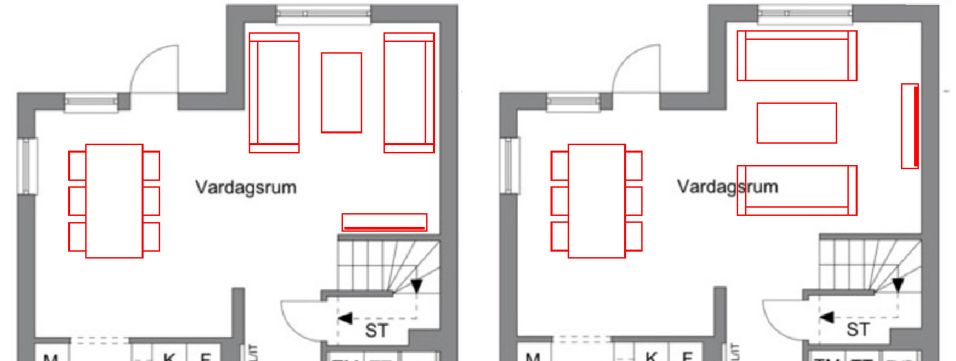 Om du tycker det första alternativet ser konstigt ut när det blir på riktigt så kan du ställa ett vitrinskåp eller något annat mot ytterväggen. Sen är det ju inte alls säkert att just dina soffor har precis den längd som Jetkokos har ritat.
