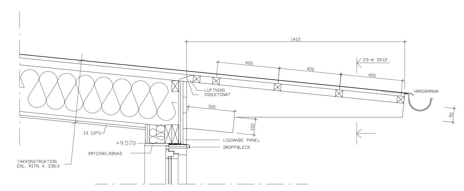 måla om huset (liggande träpanel, linolja, byggt 2001). Vi har ingen vind utan ett svagt lutande (15 grader) plåttak med stort överhäng på långsidorna, med luftning bakom insektsnät. Se konstruktionsritning: