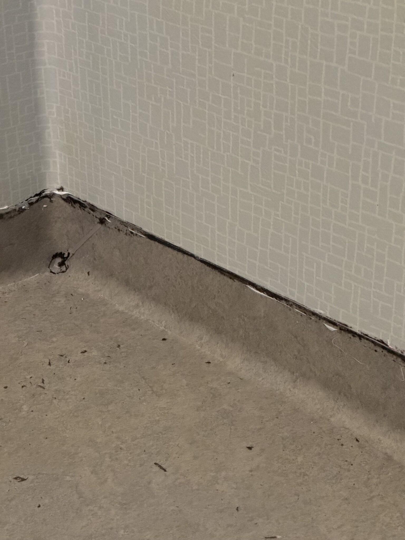 Du har en liten "läpp" som blir som en "ankstjärt" från våtrumstapeten sista mm som inte är limmad bra mot golvmattans uppvik.