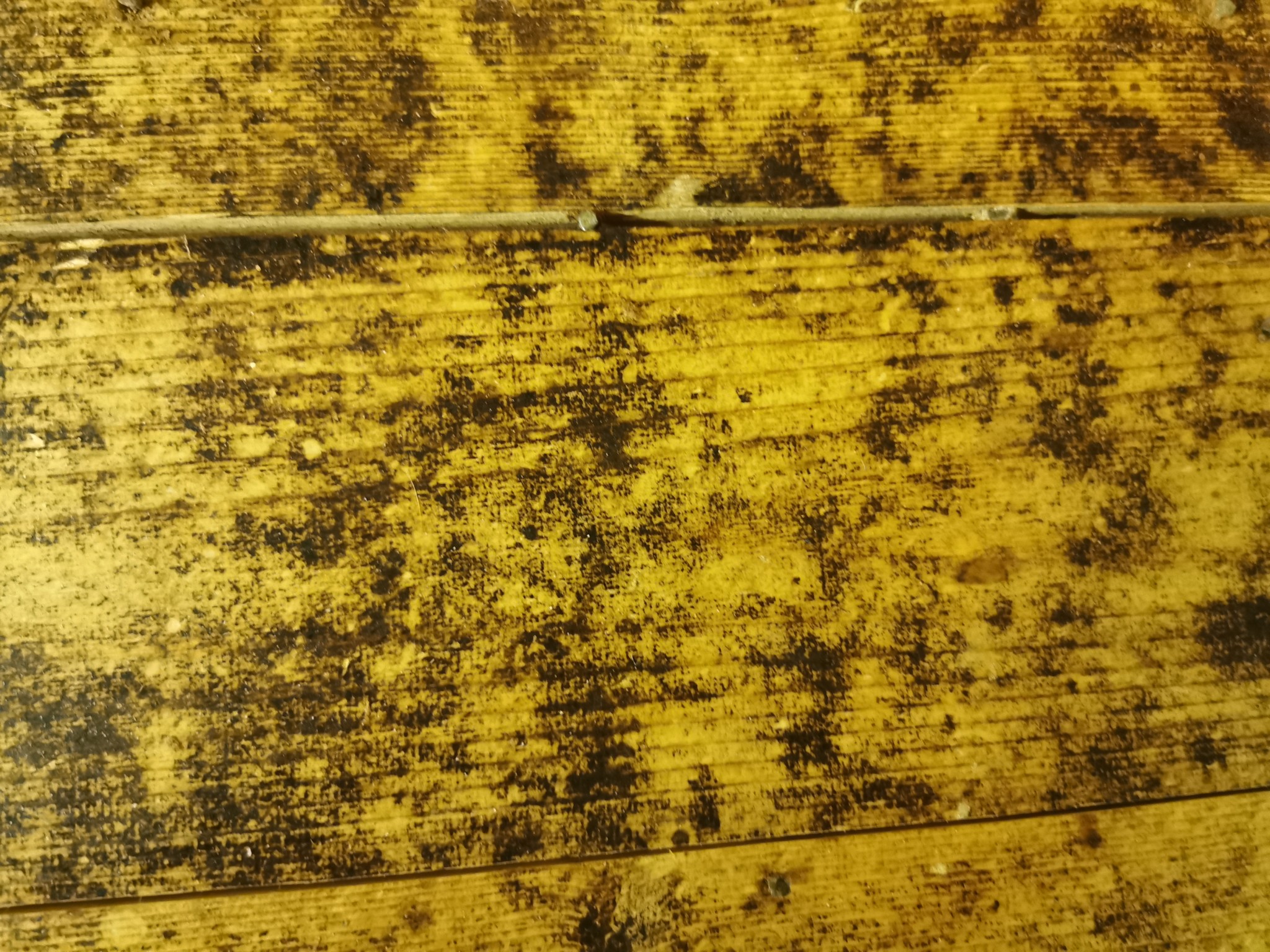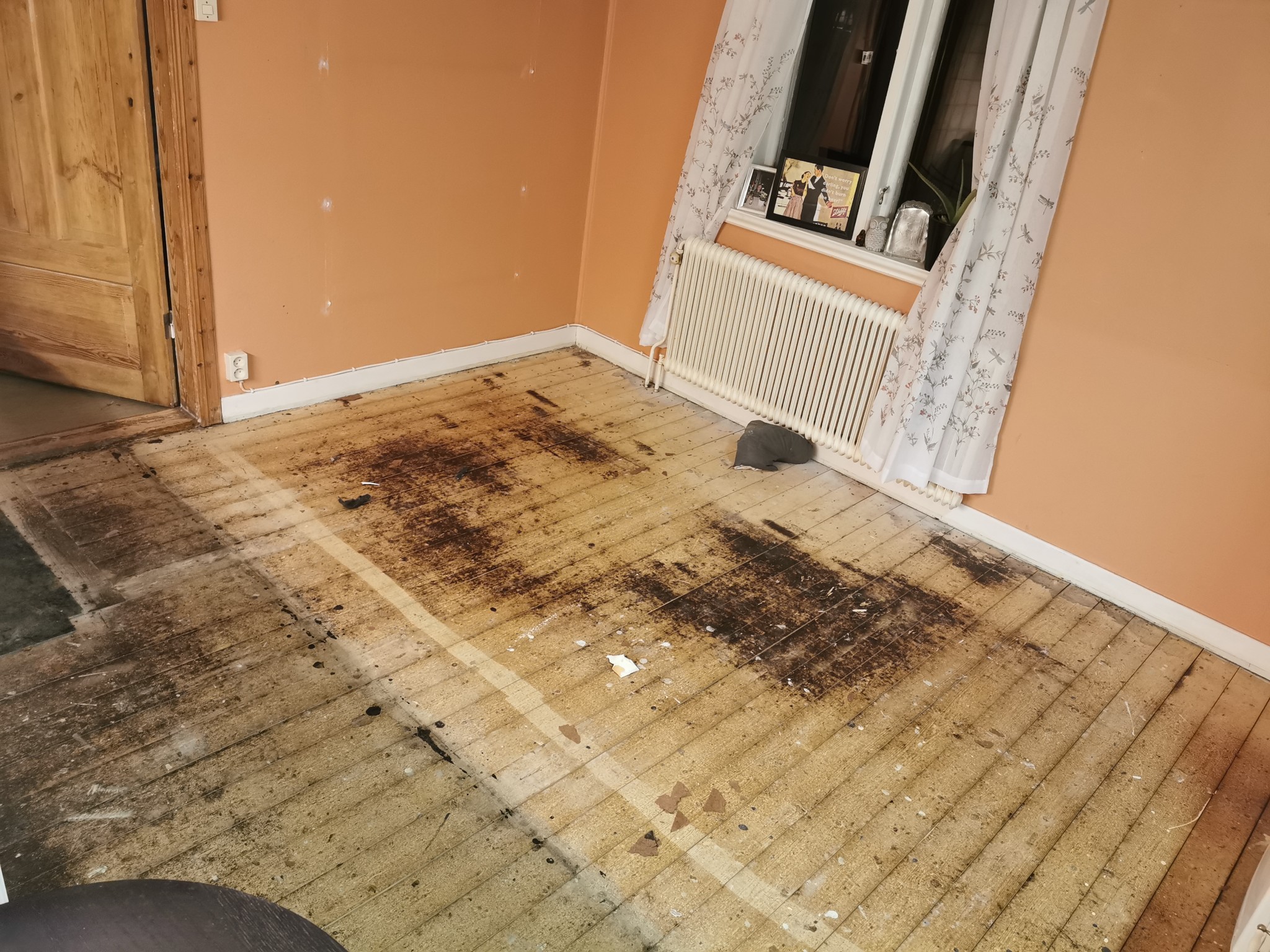 Fick blodad tand och skulle göra samma sak i det angränsande rummet, köket. Till min stora förskräckelse så är stora delar av golvet nästan helt svart. Det var en plastmatta och en masonitskiva, sen kom trägolvet. Jag tänker på svartmögel direkt.