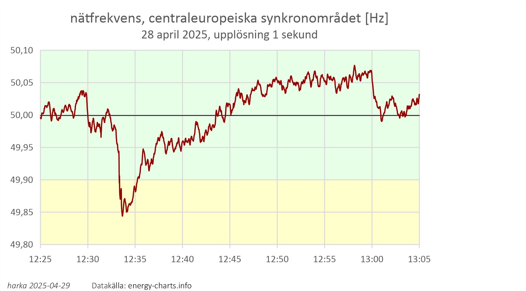 frekvensen uppvisar en störning vid 12:33 som tog den ut ur den "gröna zonen" (± 0.1 Hz avvikelse, som vi känner igen exempelvis från SvKs Kontrollrummet) i drygt två minuter
