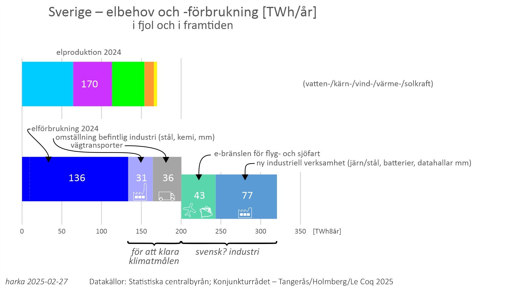 för att klara elektrifiering av vägtransporter och befintliga industrier uppskattas ett tillkommande behov på 67 TWh/år – behovet uppkommer inte över en natt utan kommer givetvis vara en gradvis övergång, där en allt senare övergång leder till allt högre kostnader (utsläppsrätterna) och tillverkade produkter framstår som fossila (påverkan marknad och pris)