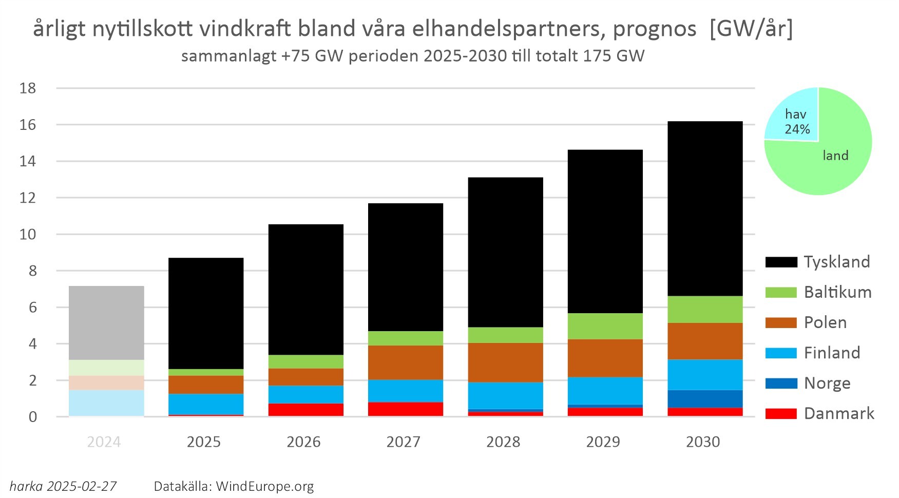 under åren 2025-2030 tror de på en utbyggnad av vindkraften bland grannarna med sammanlagt 75 nya GW – vilket borde resultera i en vindkraftproduktion år 2030 som är ungefär 225 TWh större än den är idag