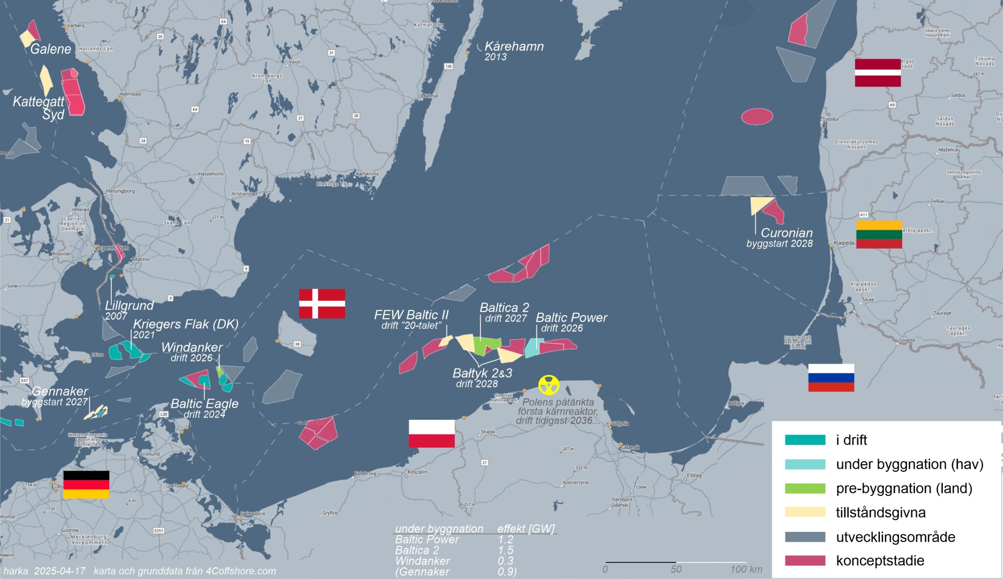 i södra Östersjön pågår för närvarande bygge utav 3 GW havsvind, och för ytterligare cirka 1 GW förefaller man ha tagit, eller vara nära, investeringsbeslut (Gennaker) då de har slutit en överenskommelse med Siemens Gamesa om leverans av turbiner på 15 MW styck (tidigare i projektet, för några år sedan, projekterade man med 8 MW styck)