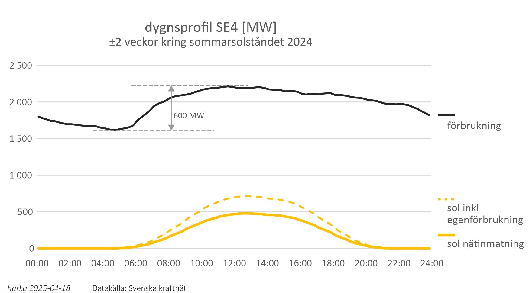 i fjol stod solkraften för 6.5% utav elförbrukningen i elområde SE4 – låt oss titta på den genomsnittliga dygnsprofilen under fyra veckor runt midsommar i fjol, "då all annan kraftproduktion kommer stanna"