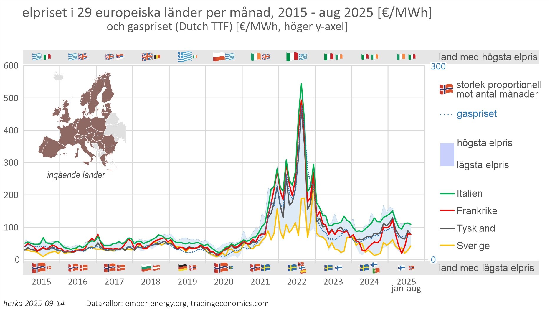 i grafen återfinns ett ljusblått band som spänner upp min/max-nivån bland de studerade 29 länderna, med fyra länder särredovisade, liksom gaspriset (höger y-axel)