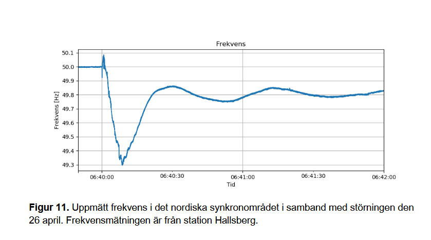 När de två reaktorerna i Forsmark försvinner från elnätet tappar systemet cirka 2 150 MW, vilket är ett större fel än vad systemet är dimensionerat för. Frekvensen faller då till 49,3 Hertz.