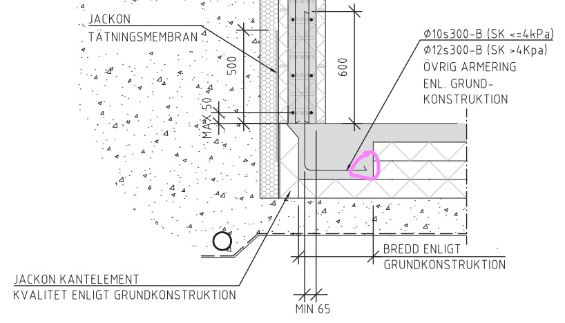 På bilden nedan avslutas armeringsjärnen med ca 135° skarp vinkel.