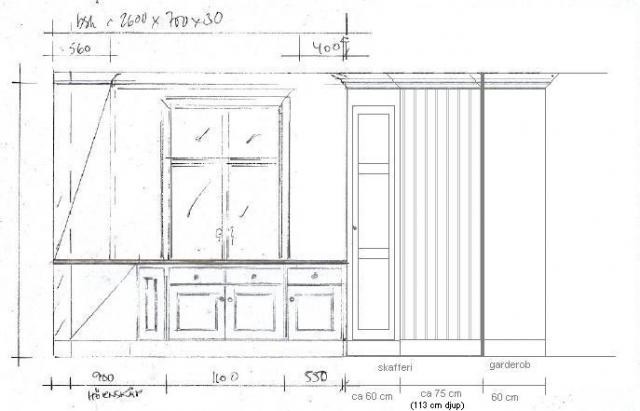 Köket är 267 cm högt och skåpen kommer att gå hela vägen upp så att man slipper damsamlaren. Plus att det ser mer platsbyggt ut om det går upp till taket. Spisdelen och kyl/frys ligger i hörnan mitt emot "L"-et. Där är det inte så mycket snickerier, så dom gjorde ingen ritning på det än. Men det kommer att bli ett par skåp över kyl/frys och en 25 cm bred lådhurts bredvid spisen.Mr Lloyd Wright skrev:Det ser ut att kunna bli ett fint kök! Hur har ni löst det med ugnen och kyl/frys? Vårt kök är ung lika stort och vi kommer också ha L-form vilket gör det extra intressant att se hur ni planerat. Hur högt är köket? Går det ända upp till taket?