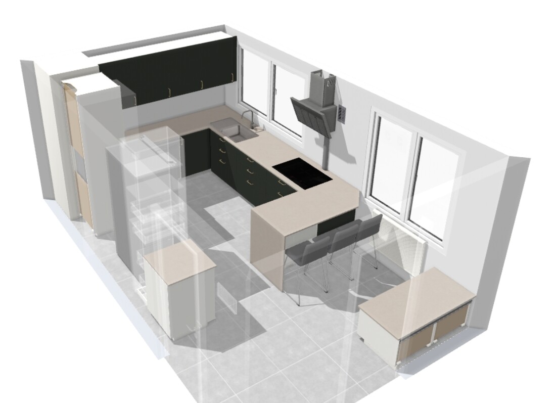 Men "kökshalvön" ser mera ut som ett köksbord. Som skulle passa bättre framför fönstret med sittplatser på båda sidorna.