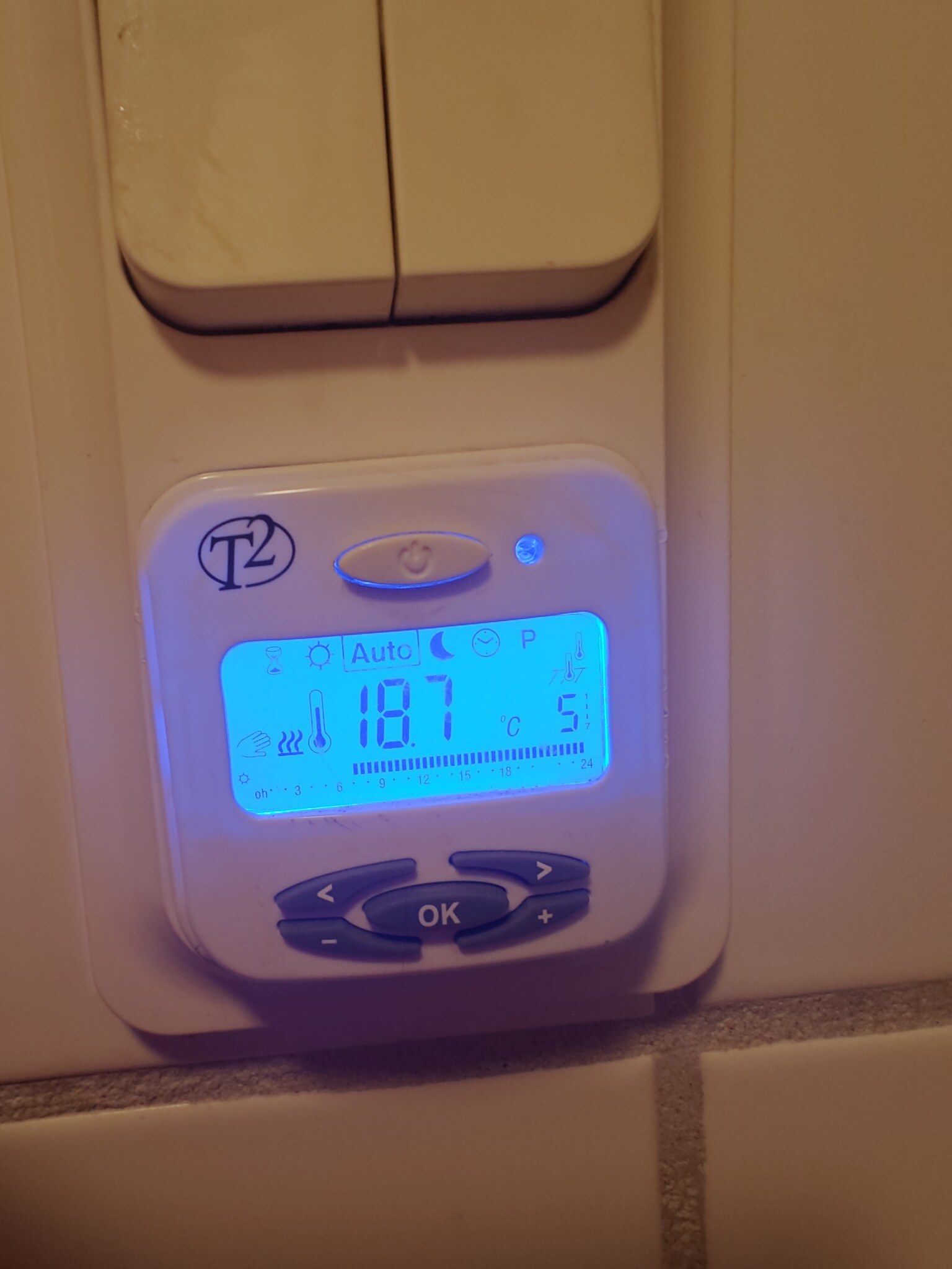 Golvgivaren visade först 25°C, och nu efter att ha varit på i cirka 120 minuter (ikonen för aktiv värmekabel har visats hela tiden) enligt termostaten så visar den 24,6°. Någon värme i golvet kan jag dock inte märka, och mina fötter uppskattar den faktiska temperaturen till ungefär snäppet över jordkällare.
