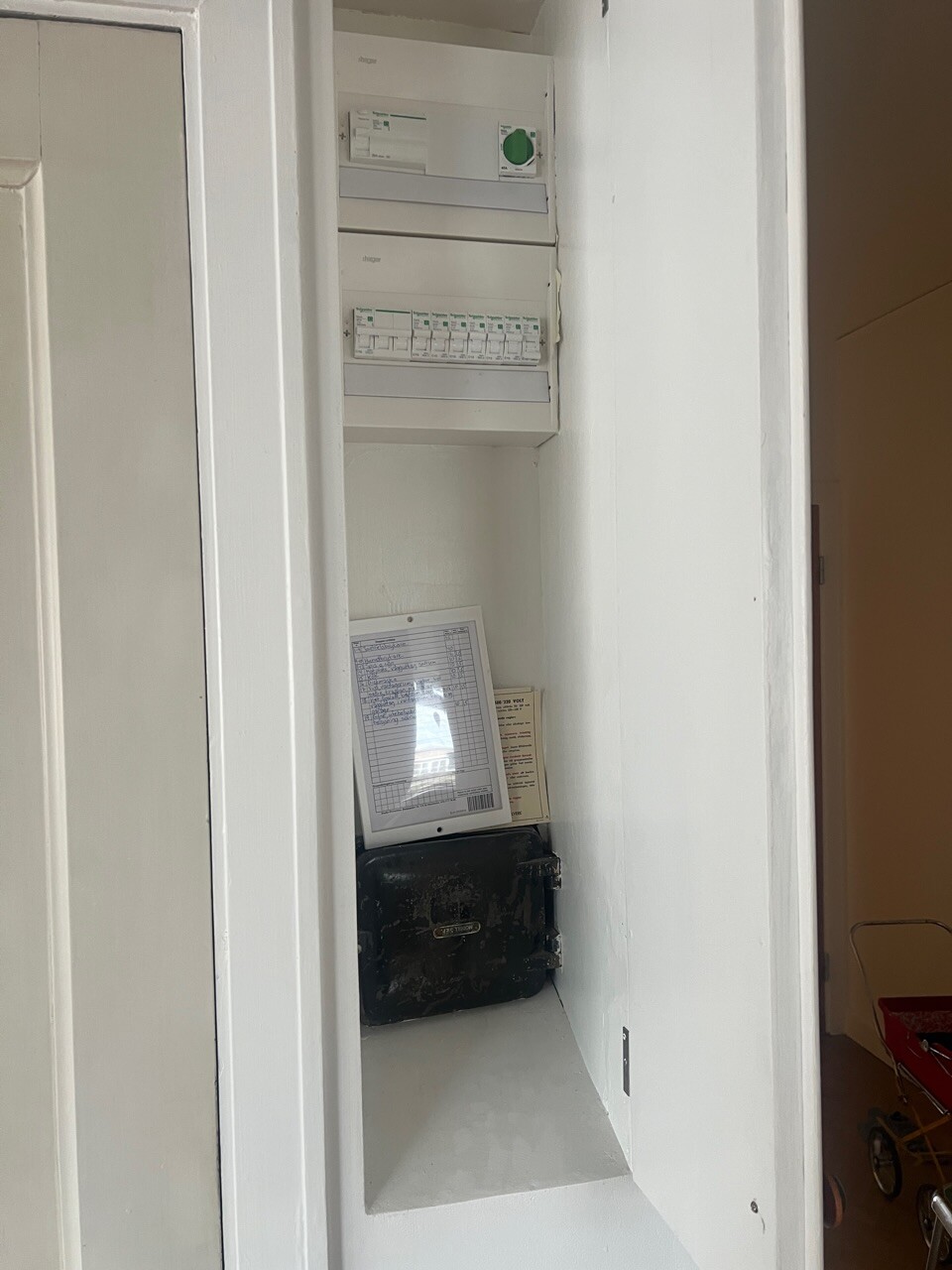 Jag funderar på att ta bort denna gamla elcentral eftersom elen gjordes om för två år sedan och finns en ny central 40 cm ovanför. Den gamla kabeln går rakt ner en sådan svart som ser ut som en orm, men jag kan inte hitta var den kommer ut i källaren. Samtidigt har jag sett att kabeldragningen från den nya centralen går en helt annan väg, via trappan ner.