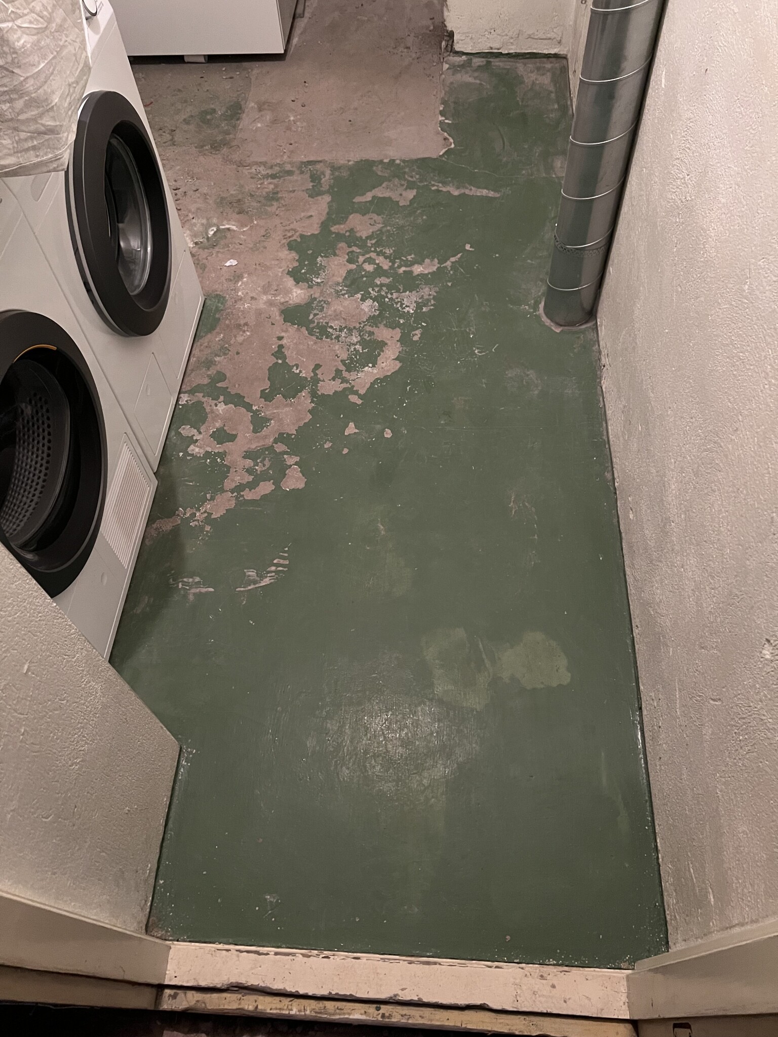 Vi håller på att renovera och ska göra om pannrummet till tvättstuga (och pannrum). Huset är byggt tidigt 60-tal och nu är det betonggolv som är målad med någon färg som sitter hårt. Vi har stambytt och eftersom vi ska lägga klinkers ska det flytspacklas. Hur är det med den gamla färgen på golvet, kan man prima bara och sedan flyta eller behöver man ta bort färgen först? Har hört lite olika.