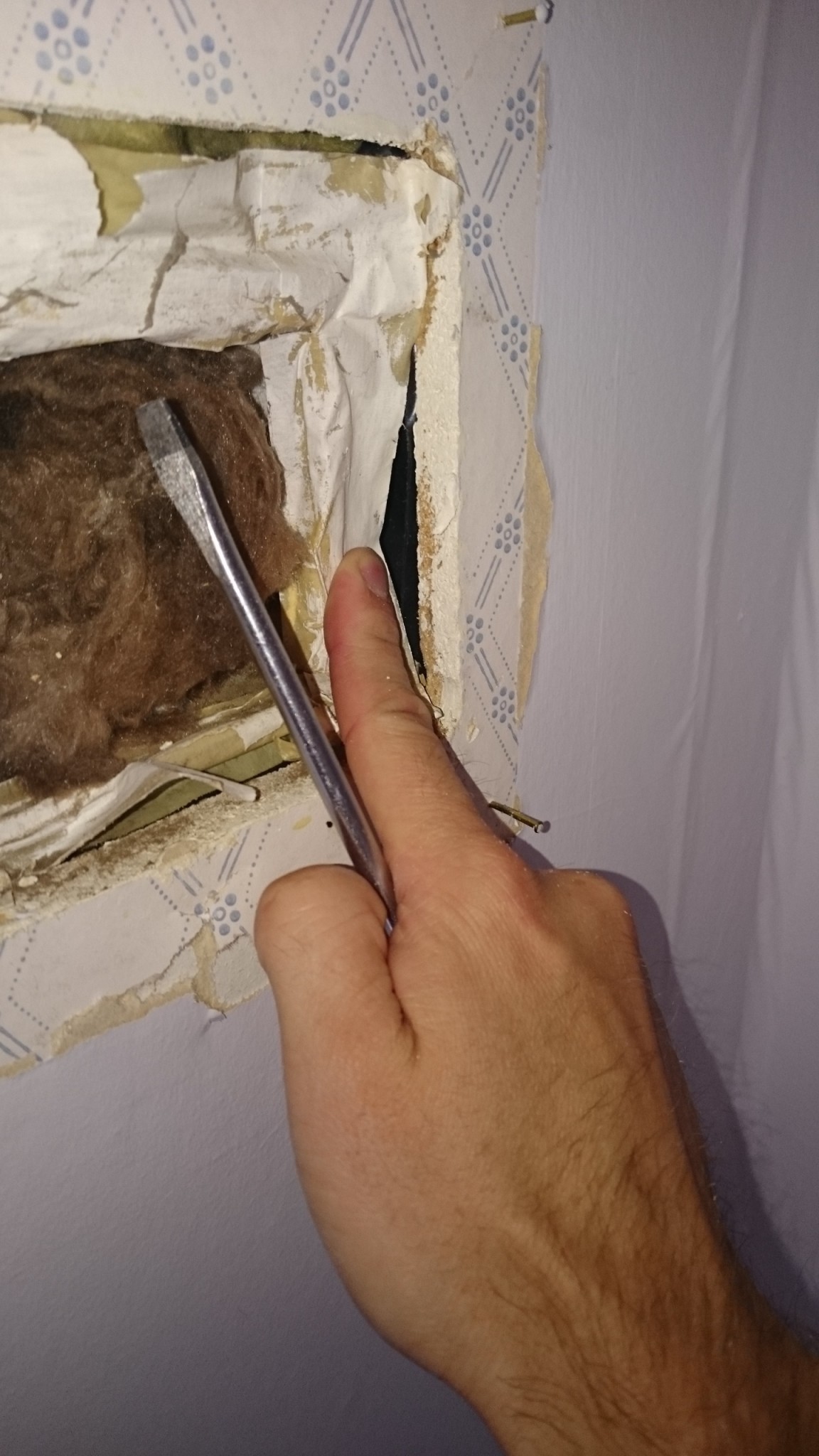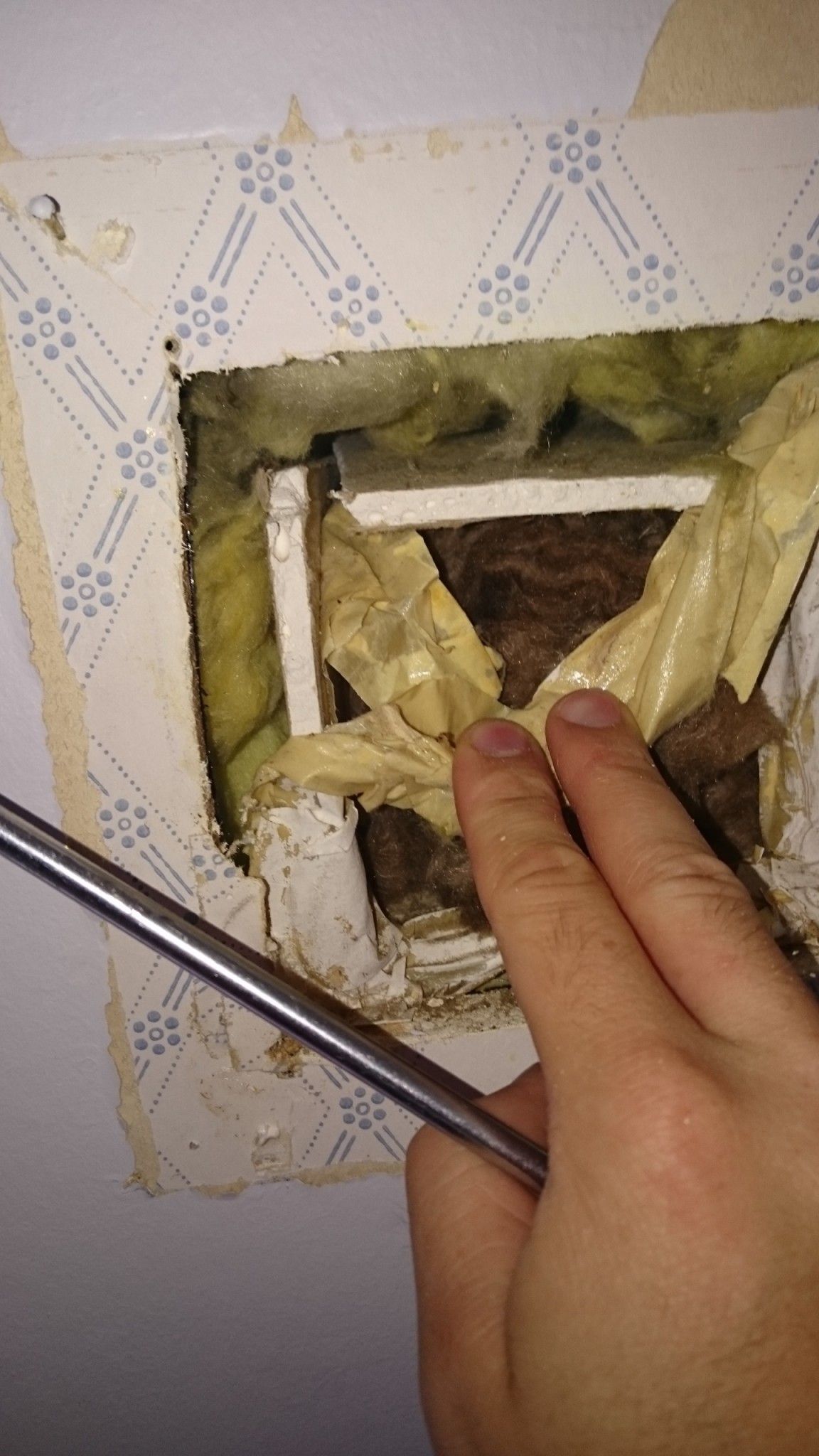 Väggen ser ut som på korten nedan. En spånskiva med svart plast bakom. Ska jag bara låta isoleringen ligga kvar, ta bort lite mer spånskiva, tejpa ditt ny plast och sen täcka det med gips/osb? På utsidan sitter ventilen kvar men det tar jag nästa sommar. Funkar det månntro?