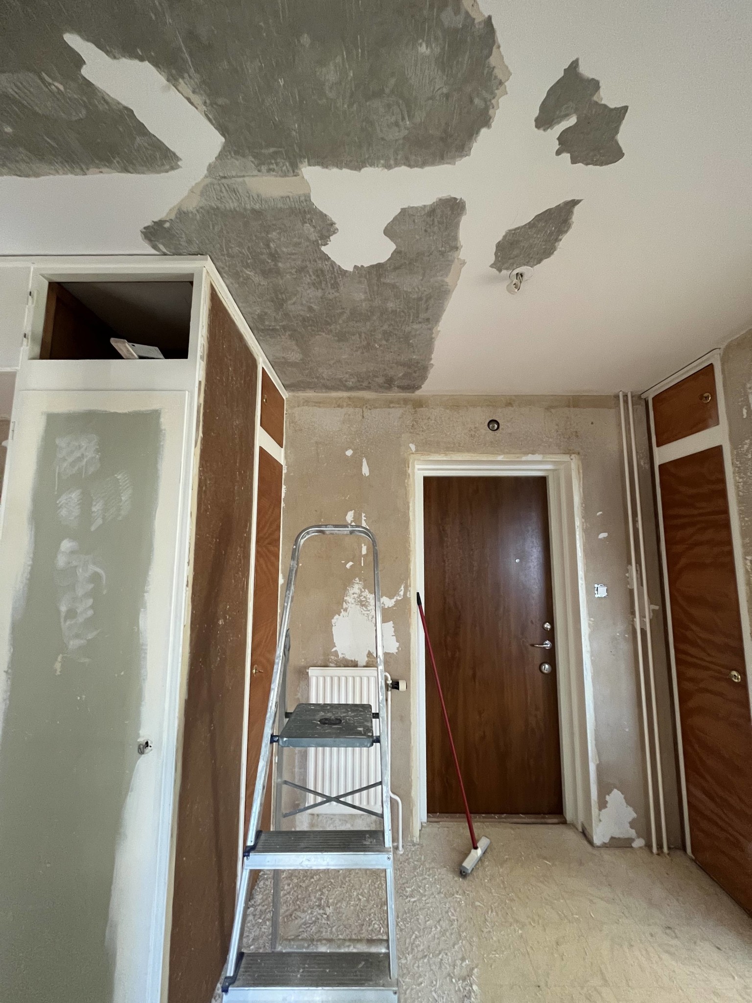 Jag använde därför ett knep från tapetrivning: koka vatten, häll det i en tryckspruta och fukta ner taket. Funkade förvånansvärt bra (bättre än på tapeter) på just detta taket så det var skönt. Tror inte ens det behöver vara varmt vatten (funkade bra kallt också) men kanske hjälper lite. Sen var det bara att ta en tapetskrapa & stege och börja skrapa, främst den yttersta sanden, för det interna materialet kommer bort lätt med slipningen sen.