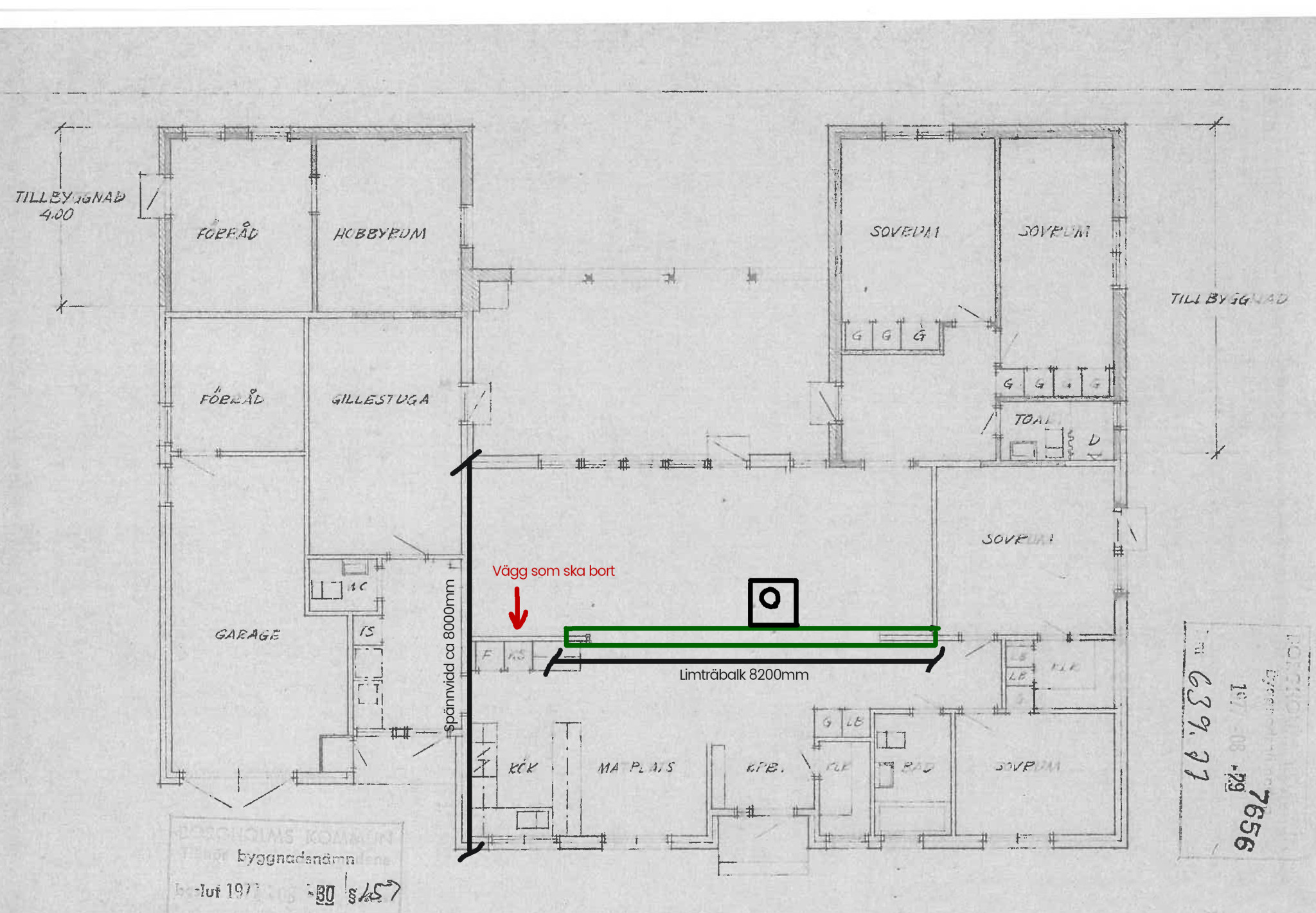 Det var lite så jag resonerade i början också, att den inte hade någon riktig mening, men vågade inte riktigt haha.J justusandersson skrev:Diagonalstången (utsatt för dragkraft) närmast skorstenen måste återställas. Den består ursprungligen av två parallella brädor, men den måste inte ha det utseendet. Jag förstår inte meningen med limträbalken, men det gjorde antagligen inte de som satte dit den heller. Jag lutar åt att du kan göra det enkelt för dig och bortse från den. Den vilar uppenarligen på underramarna. Den väger ca 16 kg/meter så den gör inte så mycket skada. Kolla att det inte finns några pelare i den röda väggen innan du river den.