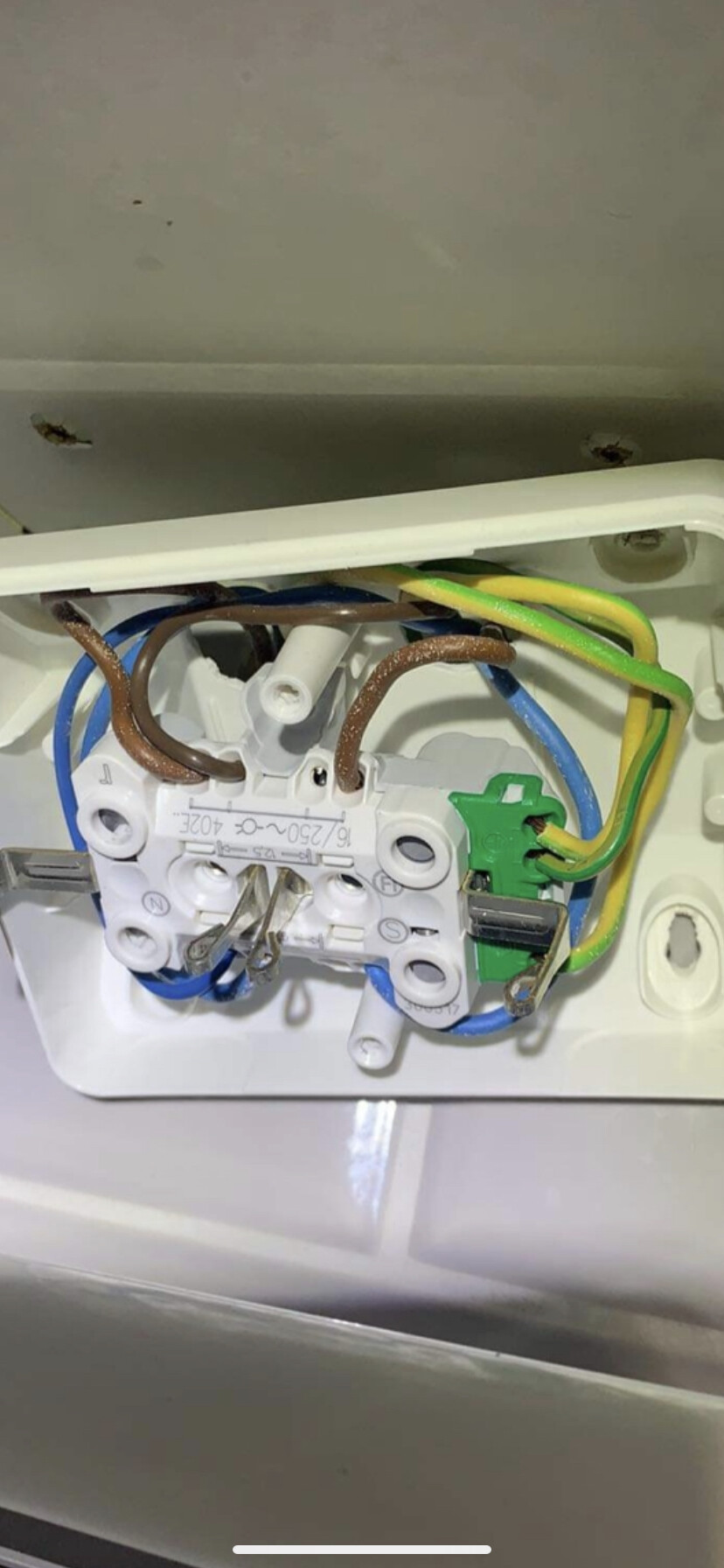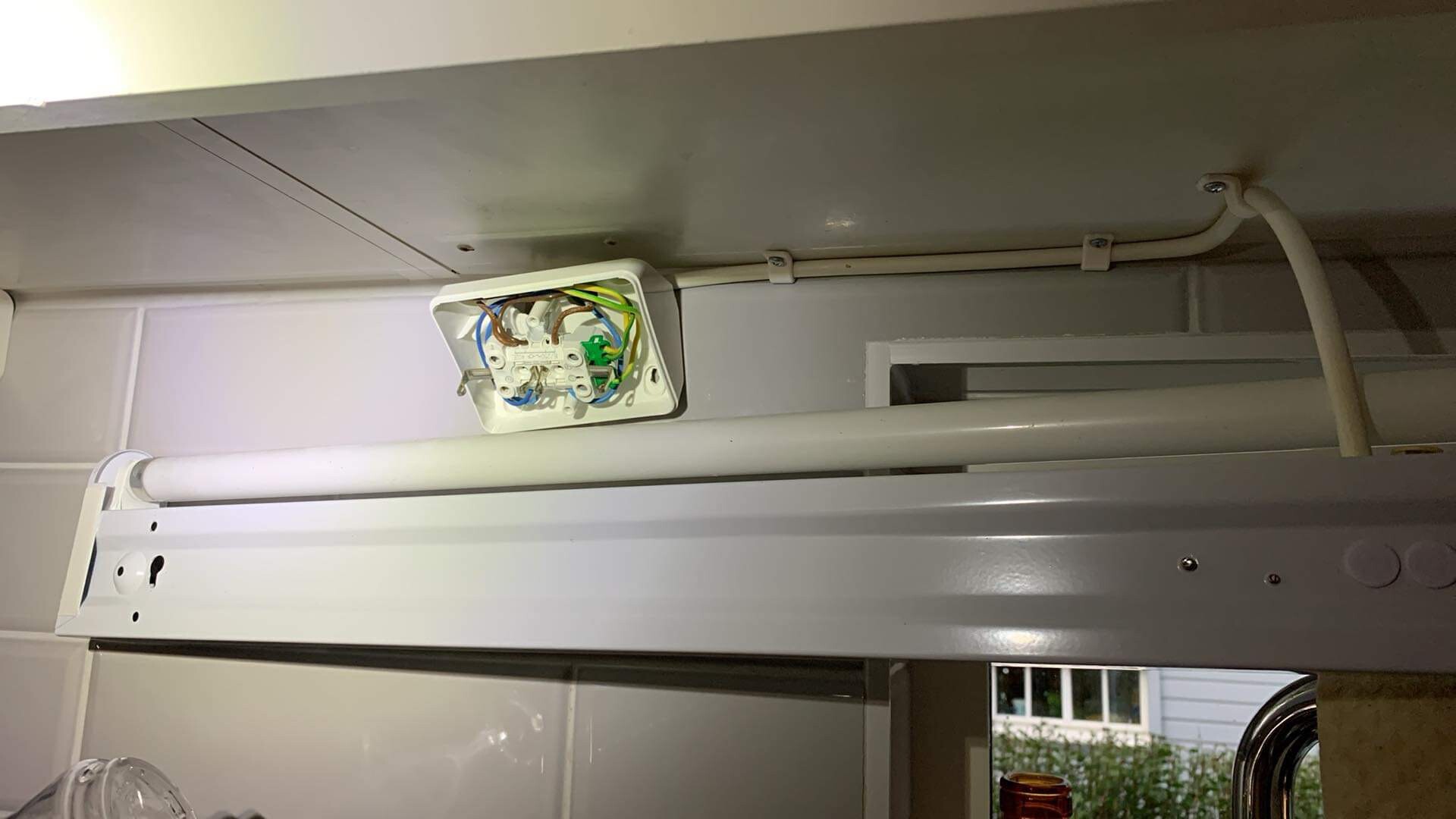 Diskbänklampan ramlar ner hela tiden. Dåliga skruvar och konstruktion i allmänhet.. nu ska den bort och ersättas med något annat. Jag försöker koppla loss lampan men stöter på bekymmer. Jag får inte loss kablarna; den grön/gula, blå och bruna från plastgrejen inuti hörnboxen.