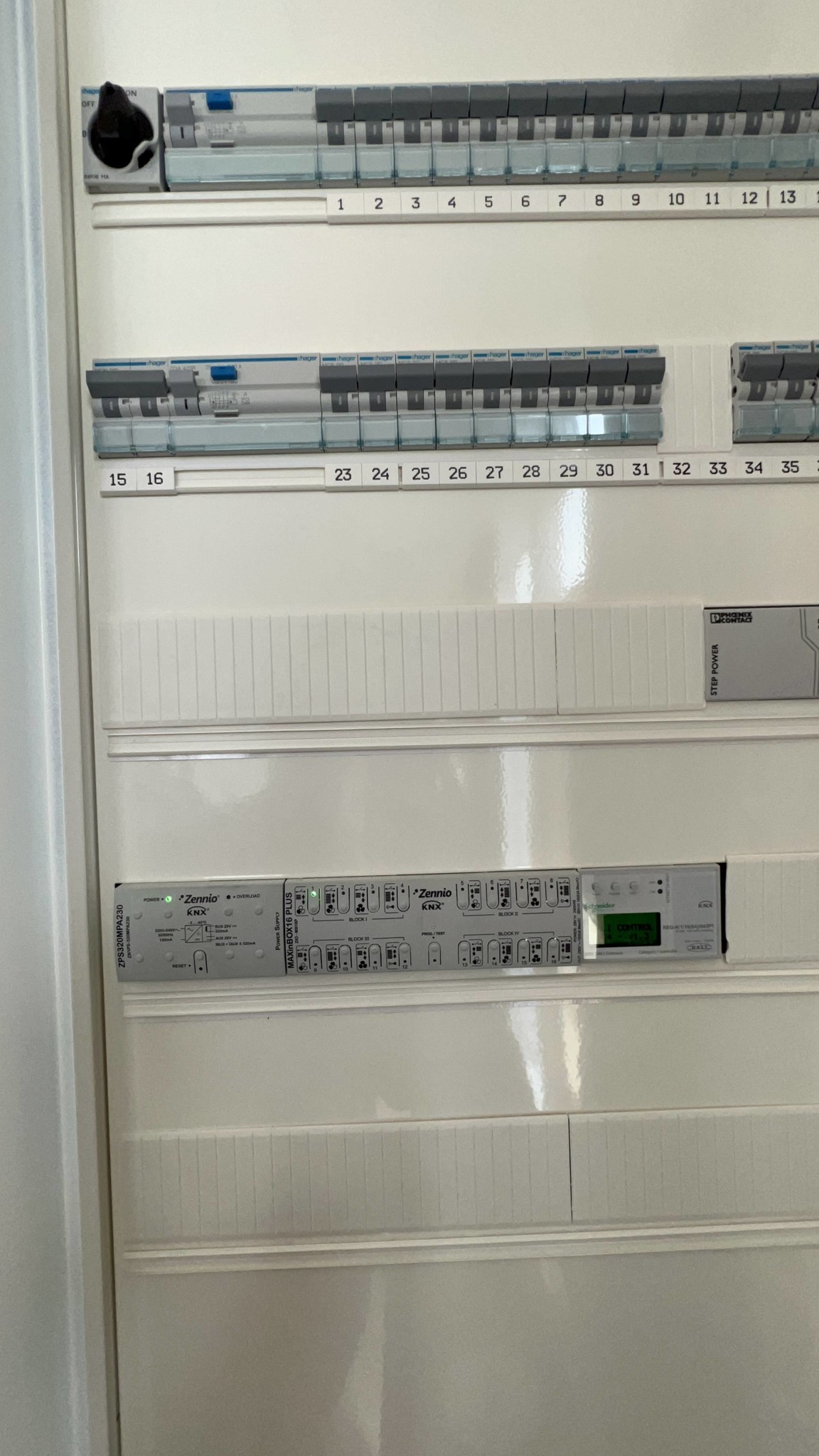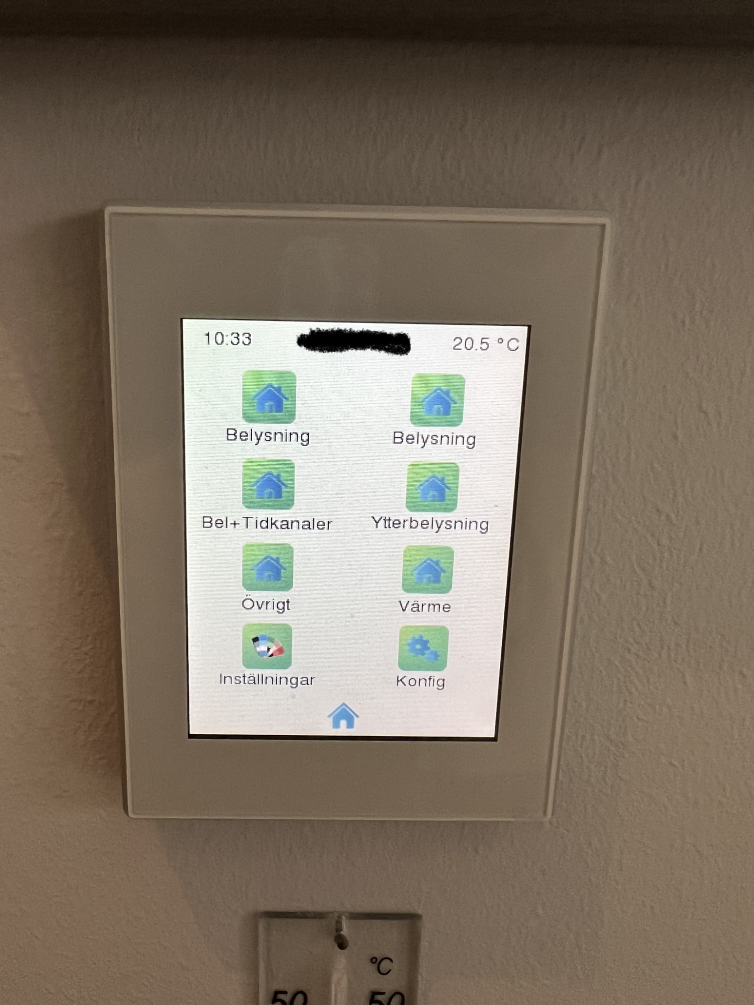 Nuvarande ägare är inte helt tech-savvy (men har trots det installerat ett knx- system)och verkar ha styrt allt via en fysisk panel (se bild) och elektrikern verkar ha konfat allt. Se även bild på knx-enheten i elcentralen.