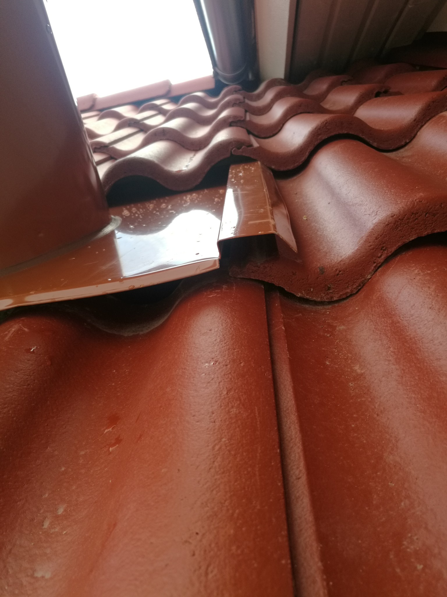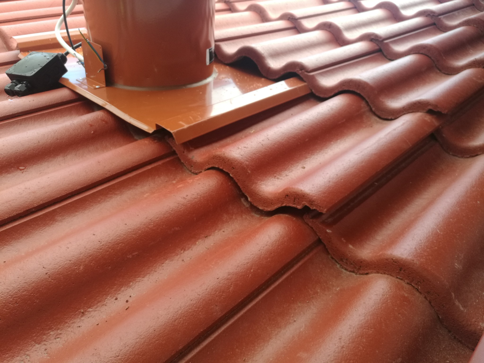 Att dem fått plåten under takpannan på vänster sida är det som gör att det ser snett ut och takpannan till höger trycks upp.