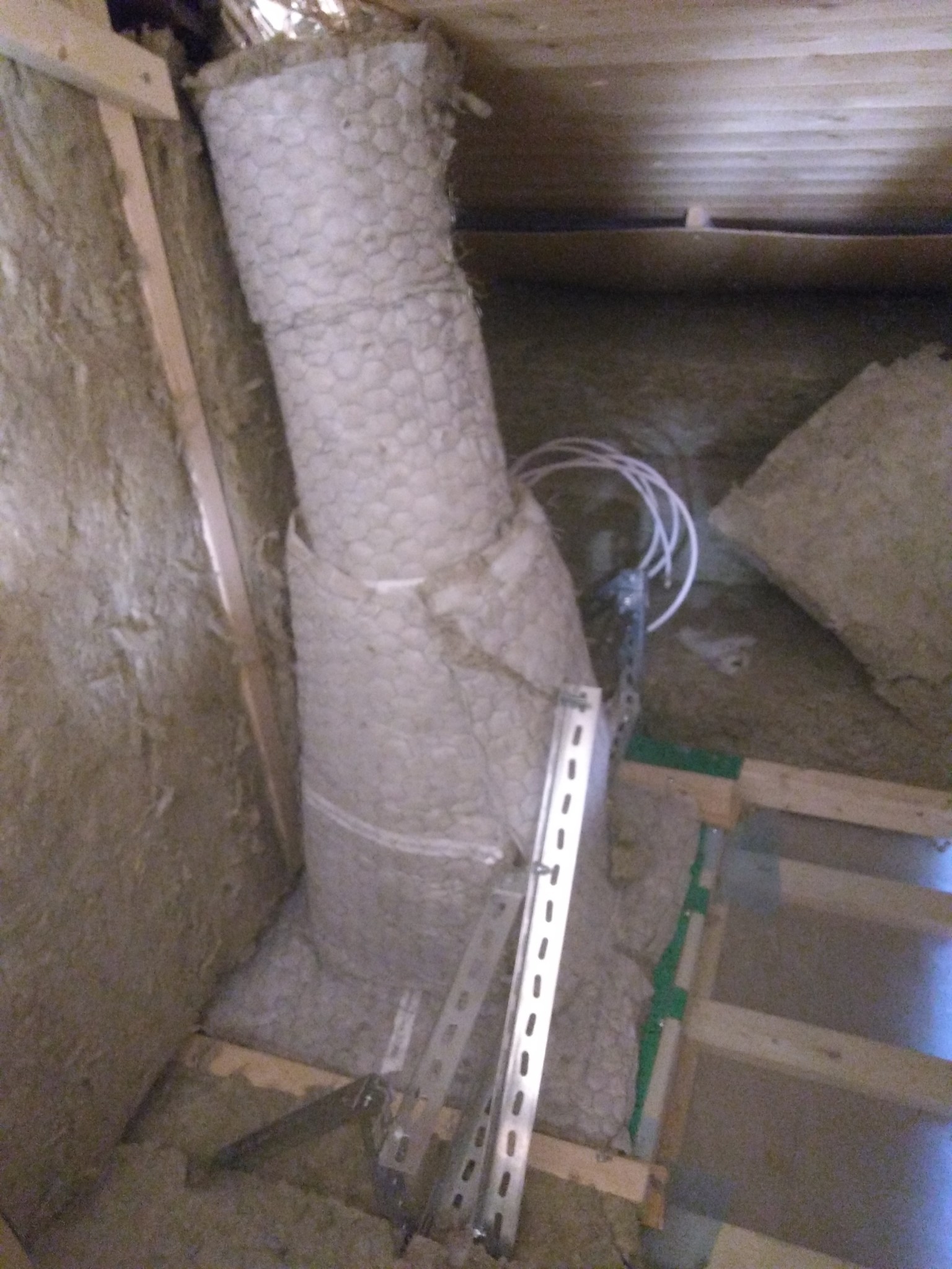 Jag har monterat en liknande och fått godkänd av sotare, jag täckte allting med brandmatta med metallnät som syntes på vinden, ända upp till den takkupa jag satte på taket (som var isolerad och godkänd för att användas som imkanal)
