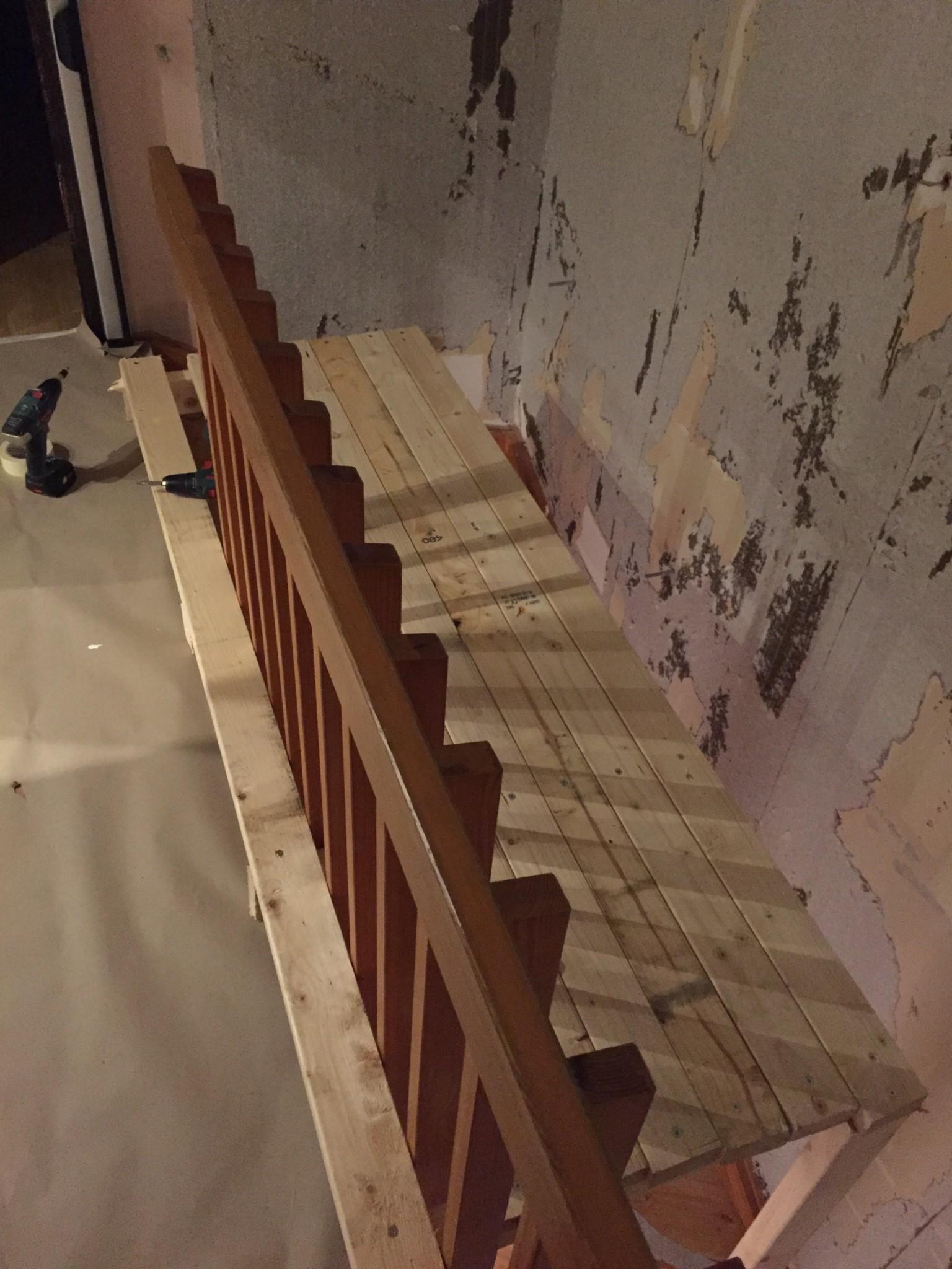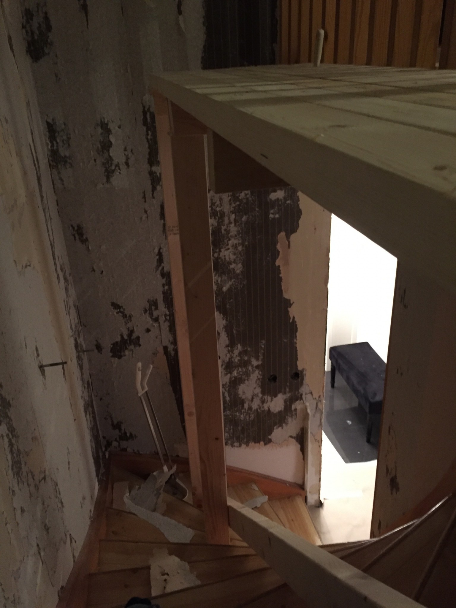 Det andra som nämns i tråden med stege och brädor fungerade inte i min trapp då den är U formad.