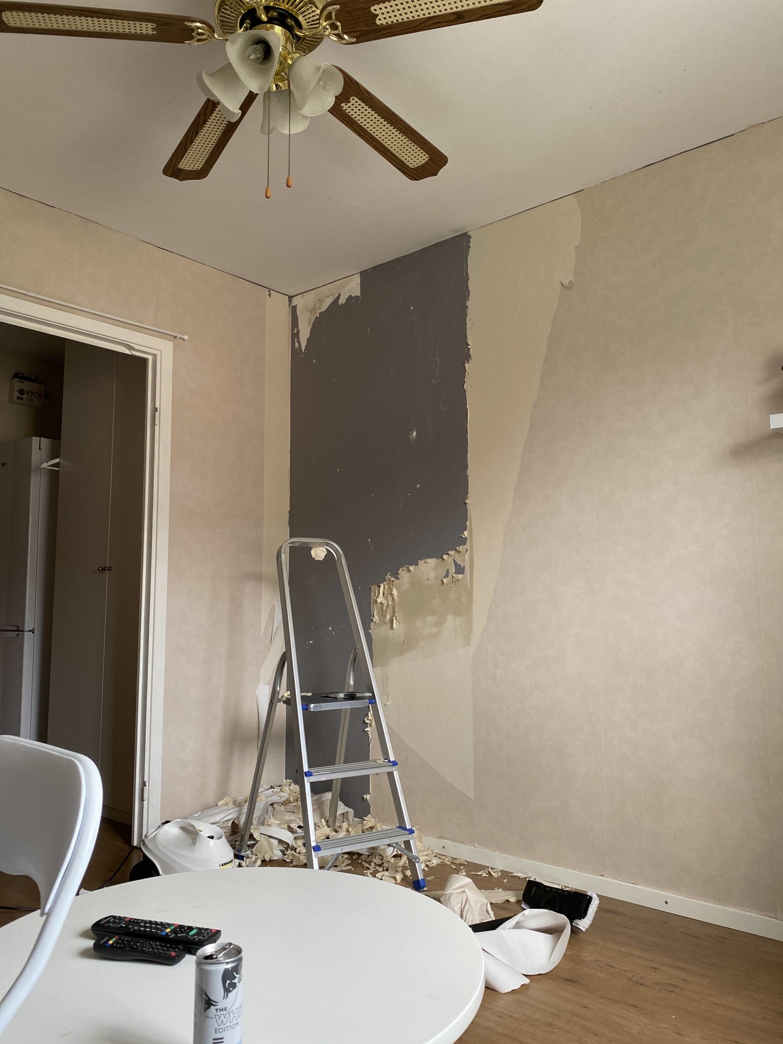 Tänkte först ta bort alla tapeter, men insåg att det blir ett väldigt jobb att få bort allt. Med ångmaskinen går det ok att få bort första tapeten. Om jag nu skulle skära bort tapetskarvarna och sedan bredspackla på den grå tapeten, behöver spacklet täcka 100% av väggen, eller drar man så tunt som möjligt?