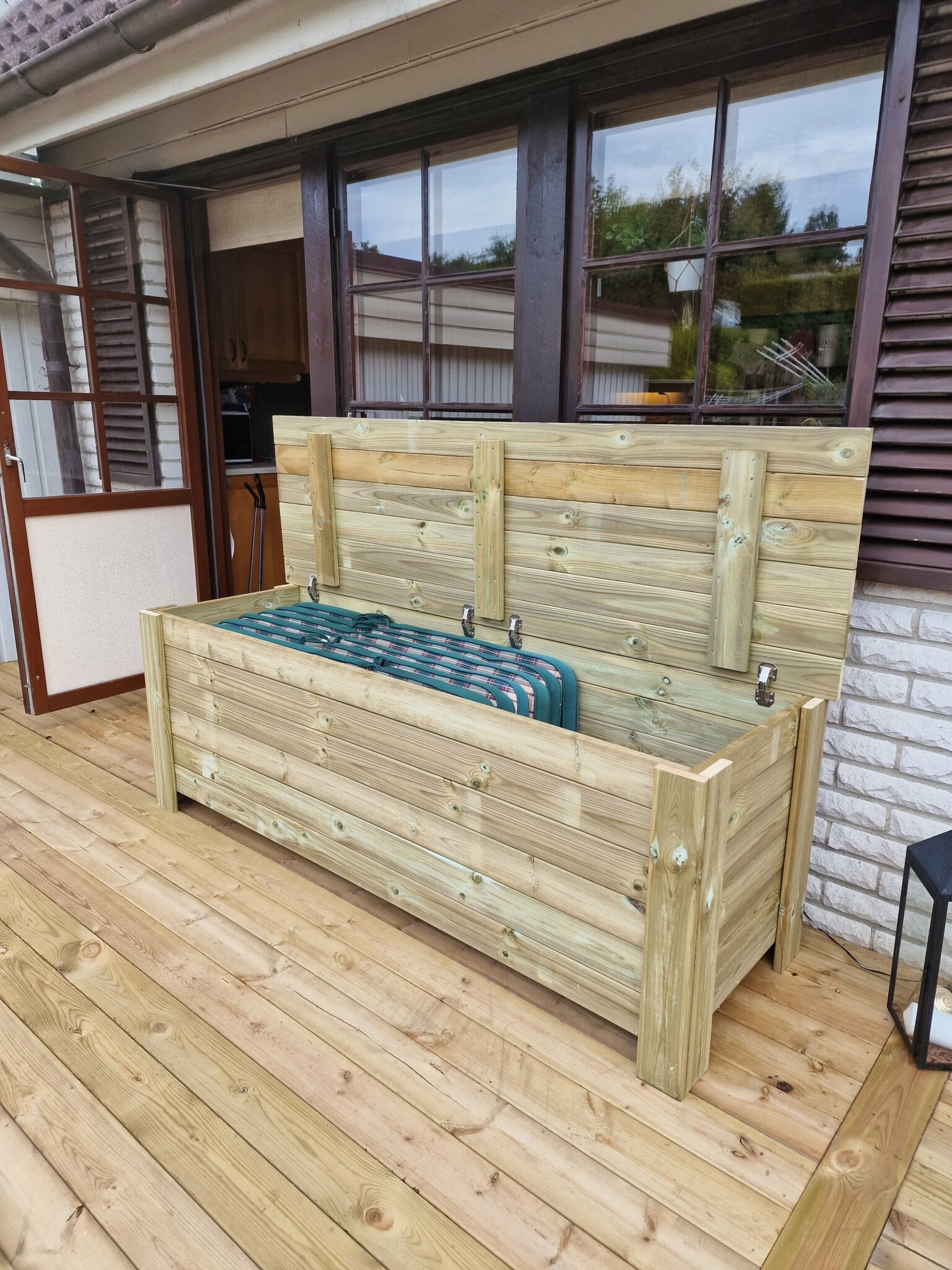 Vill du ha trälocket som det ser ut utifrån? Jag skulle säga att bästa sättet att skydda dynorna är att lägga korrugerad plåt med lite lutning utåt på locket och lite överhäng. Sedan lämna sidorna och botten som de är. Men det ändrar utseendet en del. Jag har sett lösningar med någon typ av golvmatta av plast på locket. Det kan också fungera. Men det måste vara överhäng.M Förstagångsköparen skrev: