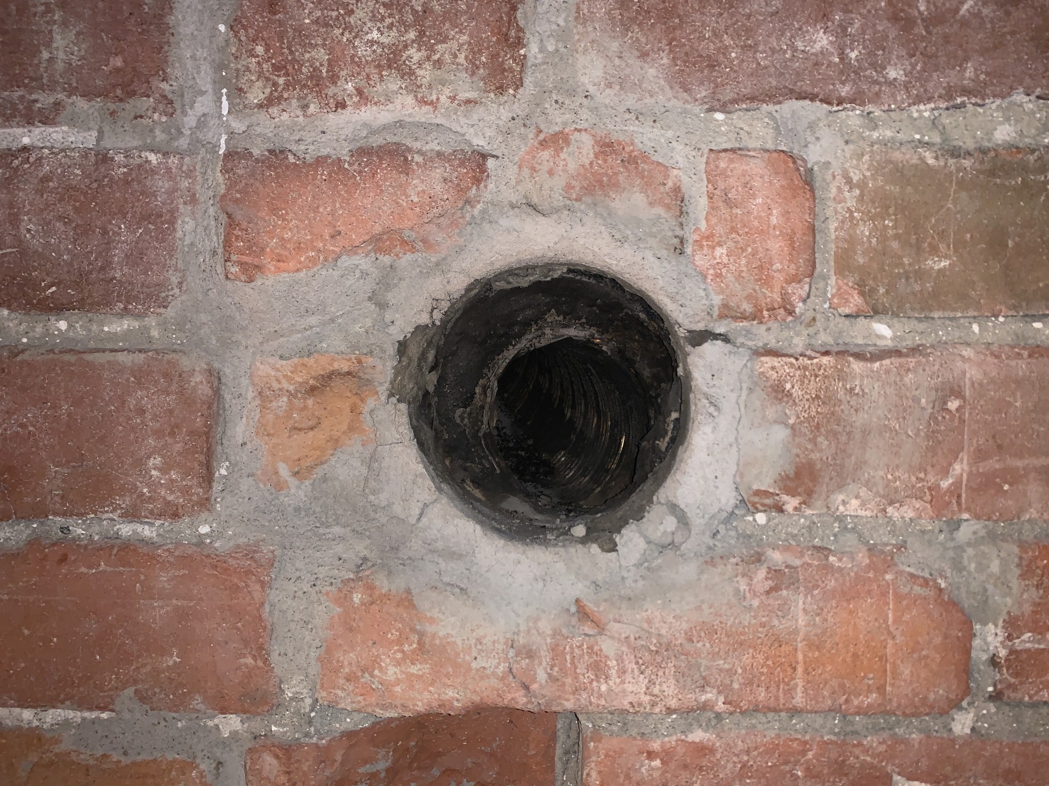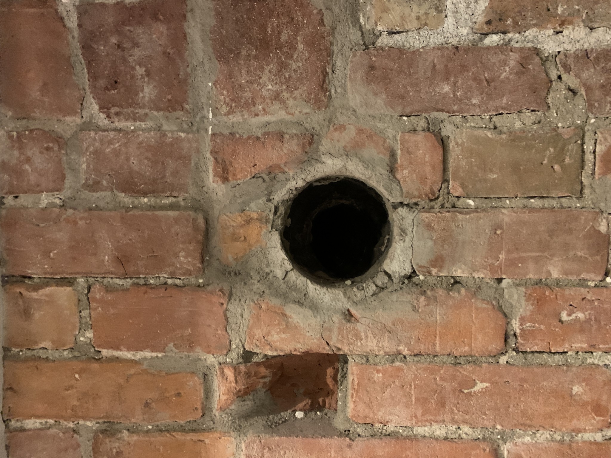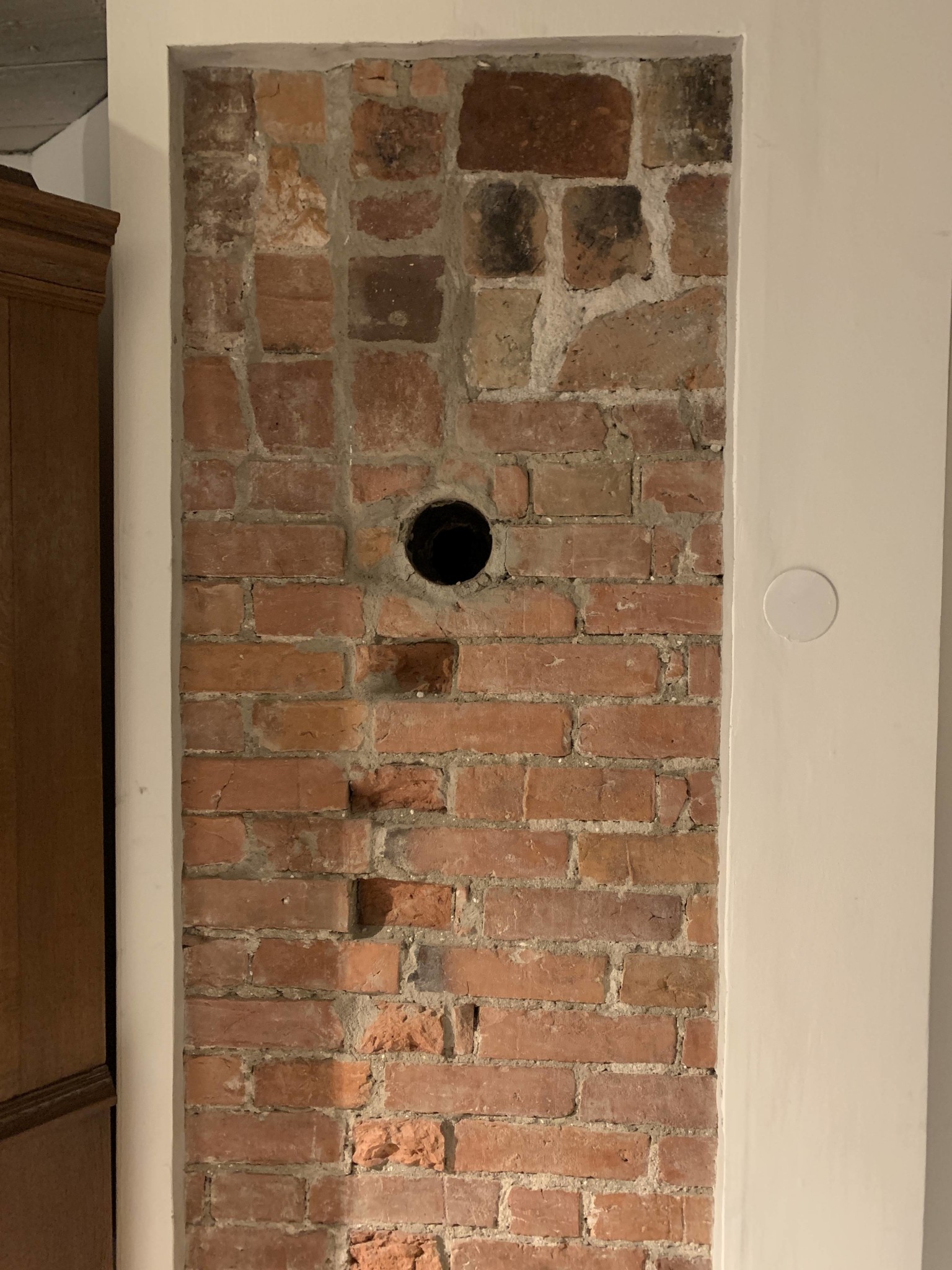 Badrumsvägg framför oanvänd rökkanal och frånluftskanal i skorsten