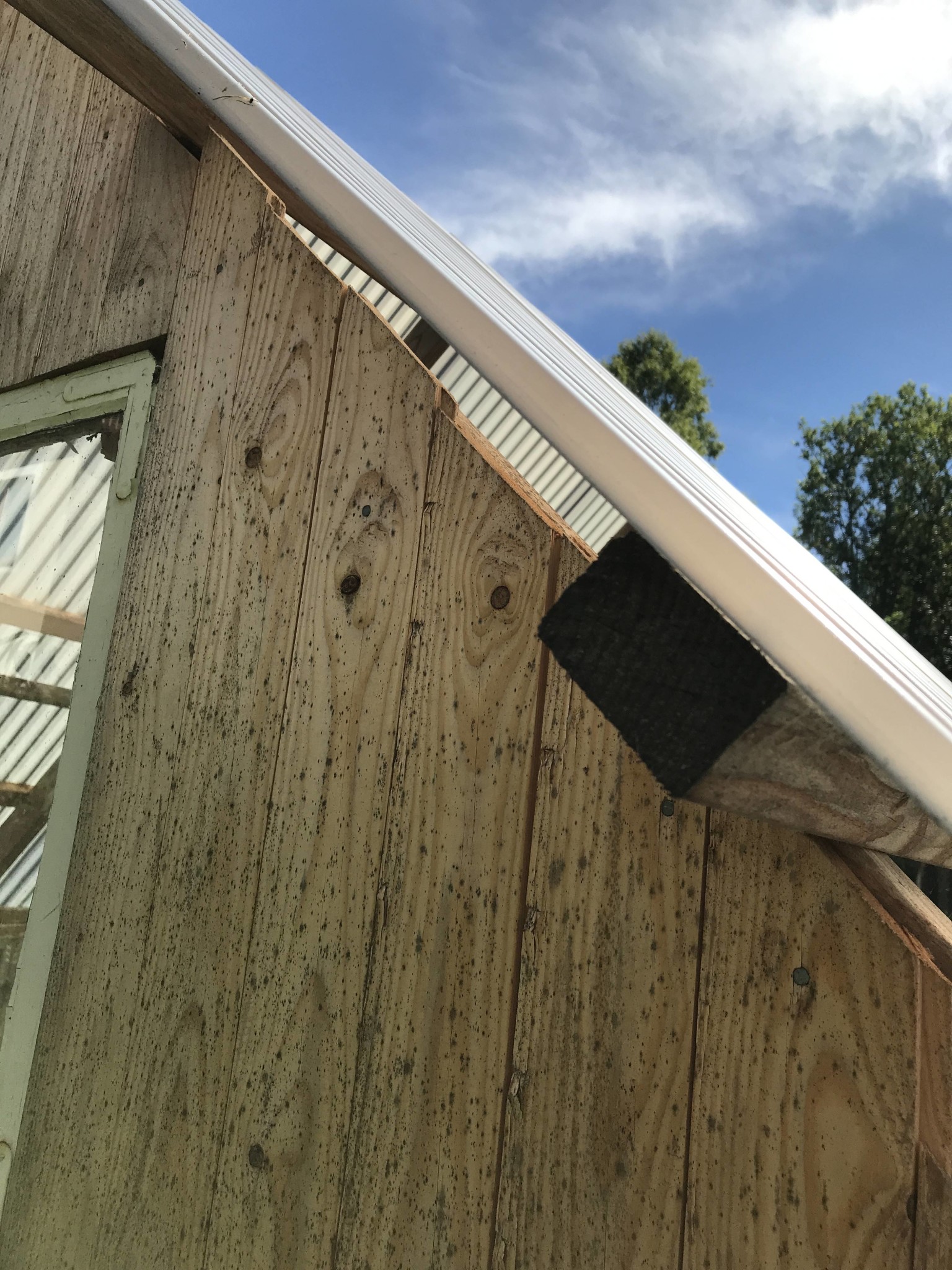 Nockplåt som sagt högst uppe och på sidorna kan du sätta upp en fasadpanel 22x120 eller 22x145 ex och såga ut för reglarna.