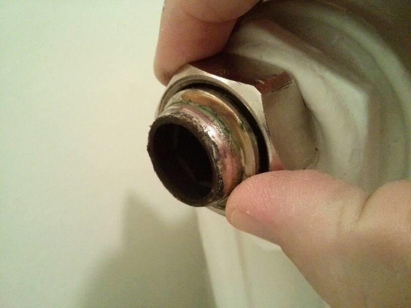 Har gett mig på att täta en anslutning som har droppat. Det är en gammal radiator och jag hade förväntat mig lekande mutter med kona som tätar. Det var det på den övre anslutningen som inte läckt: