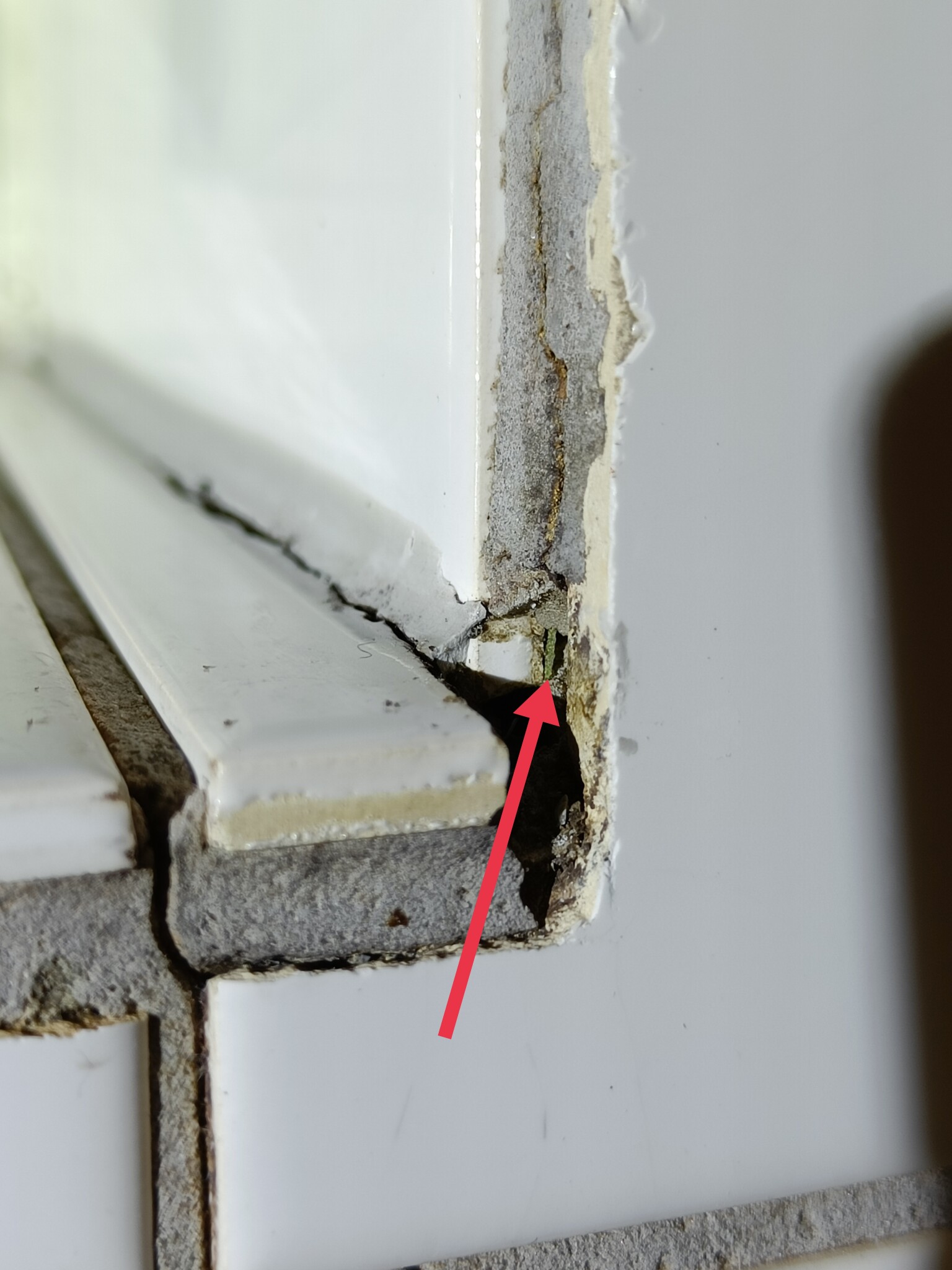 Här är en bild på ett annat ställe där man ser en grön liten flärp precis bakom en kakelplatta? Är det någon form av fästyta för kakel? Kan det vara samma grej nere vid golvet.. att det är den "hinnan" som lossnat? Tack ännu en gång!Jonatan79 skrev: